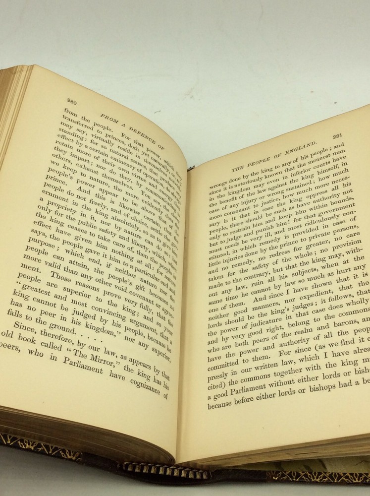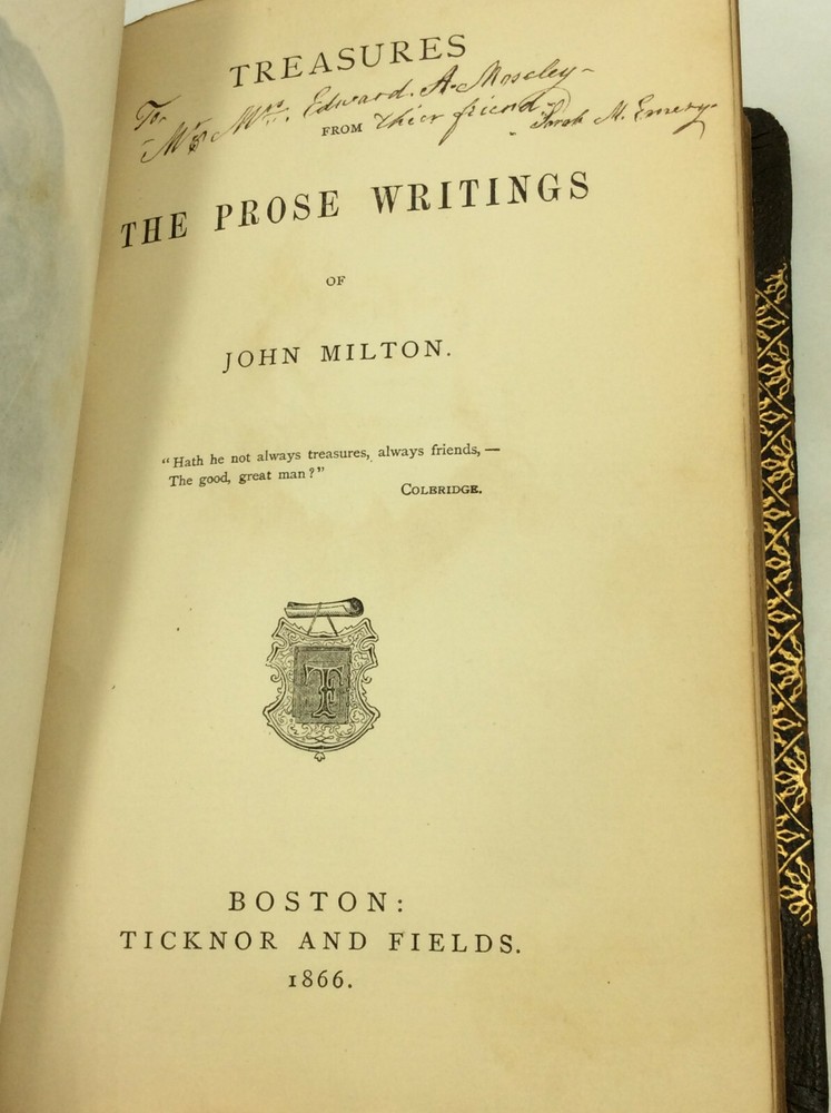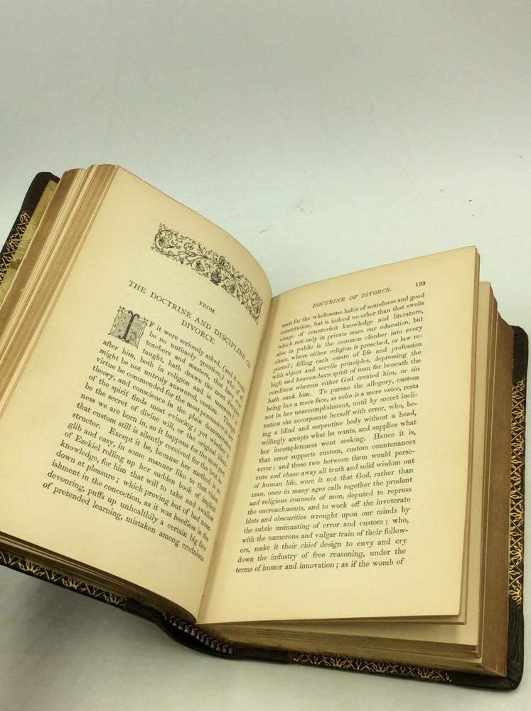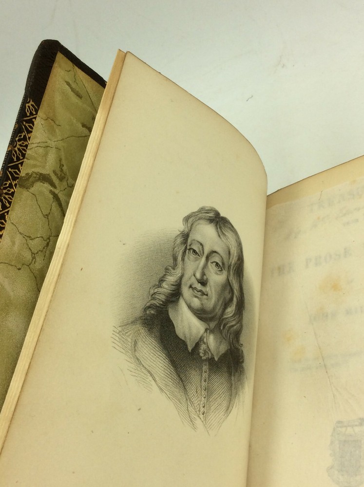 John Milton TREASURES FROM THE PROSE WRITINGS OF JOHN MILTON Boston: Ticknor and Fields, 1866. Leather. 486p. REBOUND. A hardcover book that has been rebound with a new leather spine and corners, retaining the original leather boards. Mild rubbing along the edges. Patchy tanning between the table of contents and page 1. Otherwise, text unmarked and binding tight. Very good condition overall. Item #177397