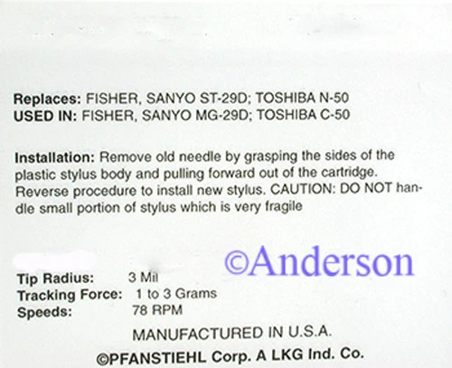 78 RPM STYLUS NEEDLE FOR SANYO MG-29 ST-29D MG-29E ST55D 740-D3 Model Pfanstiehl 740-D3 78rpm Stylus Description Replaces: Fisher, Sanyo ST-29D, ST-55D, Toshiba N-50 Used in: Fisher, Sanyo MG-29D, MG-55C Toshiba C-50 Tip Material: Diamond Tip Radius: 3 Mil Tracking Force: 1 to 3 Grams Speeds: 78 RPM Manufactured in: U.S.A .