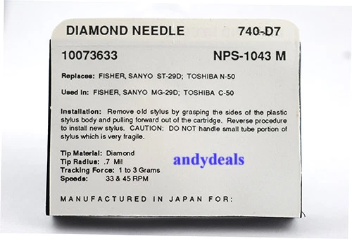 NEW IN BOX TURNTABLE NEEDLE STYLUS FOR FISHER MG29 MG-29 ST29 ST-29D 740-D7, NEW RECORD NEEDLE Empire 105-LT S105 205-LT S205 N15C N50D N51D N15C 740-D7 TURNTABLE STYLUS NEEDLE SANYO ST-29D ST29G ST55D ST57D MG29G MG29 740-D7 Model Pfanstiehl 740-D7 Description Brand New (factory box) Replacement stylus Diamond .7 mil conical tip needle Speeds: 16, 33 & 45 RPM Tracking Force: 1 - 3 grams REPLACES needles listed below NEEDLE S EMPIRE S105 S205 EVG PM3102D FIDELITONE FISHER FISHER NEEDLES 4-1579-70010 4157970010 4-1579-70010 4157970010 4-1579-7020 415797020 4-1579-70020 4157970020 4-1579-70060 4157970060 4-1579-70090 4157970090 4-1579-70150 4157970150 ST-29 ST29 4-1579-70150 4157970150 ST-57 ST57 KENWOOD N-51MKIII N51MKIII SANYO ST-55D ST-29D ST-29G ST-57D TOSHIBA N-50 N50 N-51 N51 N-50C N50C N-51C N51C N-51 N51 CARTRIDGES DENON DSN-67 DSN67 EMPIRE 105LT 205LT FISHER MG-57 MG57 MG-29 MG29 KENWOOD V-51 V51 SANYO MG-29G MG-55D ST55D ST29D ST29G ST57D MG29G MG55D TOSHIBA C-50M C50M C-51M C51M C-50C C50C C-51C C51C MODELS DENON FISHER 34 35 36 3500 3800B 3950 3950 3980 4000B-2 4000B2 4000B 4001B 4002B 4010B 400AD 4500 5560 5800 5800B 5900 6660 5950 6660 6680 6700 6700B 710 720 7790 8600 8600D AVS1085 AVS1086 BOSTON BOSTONS BOSTON380 CA272 DALLAS DAYTONA DAYTONAS DAYTONA35 G7790 HOUSTON ICS720 ICS735 LAS VEGAS MEMPHIS MEMPHIS300 MT272 MT273 MT272 MT400 MT274 MT30 MT32 MT32 MT32CB MT32CD MT34 MT35 MT35SC MT35D MT35G MT36 MT36CD MT37 MT37CB MT38 MT3G MT39 MT400 MT710CD MT720 MT720CB NASHVILLE NASHVILLE390 PHOENIX S30 S38 S58 S300 S380 S390 S650 SYSTEM273 SYSTEM300 SYSTEM350 SYSTEM380 SYSTEM 3500 SYSTEM3980 SYSTEM400 SYSTEM5560 SYSTEM580 SYSTEM5950 SYSTEM600 SYSTEM670 SYSTEM6600 SYSTEM6680 SYSTEM6650 SYSTEM7790 WASHINGTONS650 MT32 MT35C MT-35C MT-35(C) MT37 MT860 MT32 MT34 MT860 KENWOOD KP-1100 KP1100 KP-770D KP770D MGA DP-37B DP37B