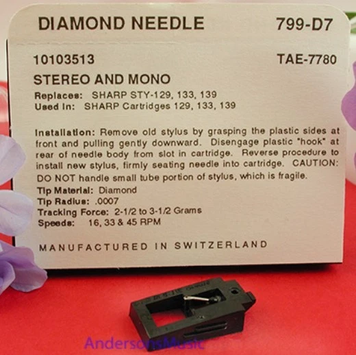 Phono needle-KENWOOD N64,N64C,SHARP STY-129,133, 799-D7, SANYO STP-50J,MARANTZ TT-253,TT-353, TURNTABLE STYLUS NEEDLE STP-50J N64 N-64 FOR MARANTZ TT-353 799-D7 Model Pfanstiehl 799-D7 Description Sharp Replacement Stylus STY-129, 133, 139 Pfanstiehl 799-D7 Brand New (factory box) Generic replacement stylus 7 Mil Conical Diamond Tip Tracking 2.5 to 3.5 Grams Speeds: 16, 33 & 45 RPM REPLACES needles listed below NEEDLES FISHER NEEDLES STP-50J STP50J KENWOOD NEEDLES N-64 N64 N-64C N64C MARANTZ NEEDLES TT-253 TT253 TT-353 TT353 CTS-243 CTS243 CTS-143 CTS143 TT-143 TT143 TT-243 TT243 TT-143 TT143 MITSUBISHI MGA NEEDLES N-5786 N5786 SANYO NEEDLES STP-50J STP50J SHARP NEEDLES STY-129 STY-133 STY-139 TOSHIBA NEEDLES N-78D N78D YAMAHA NEEDLES N-8100 N8100 Cartridges KENWOOD CARTRIDGES V-64 V64 V-64C V64C MITSUBISHI MGA CARTRIDGE RS-50 RS50 SHARP CARTRIDGES 129 133 139 TOSHIBA CARTRIDGES C-78 C78 YAMAHA CARTRIDGES CG-8100 CG8100 MODELS KENWOOD MODELS HD-770 HD770 HD-770R HD770R HD-770M HD770M HD-990R HD990R HD-990W HD990W KP-747 KP747 M-7S M7S P-5S P5S P-7S P7S ROXY-D5 ROXYD5 ROXY-D7 ROXYD7 ROXY-D9F ROXYD9F KD-74 KD74 MITSUBISHI MGA MODEL LT-156 LT156