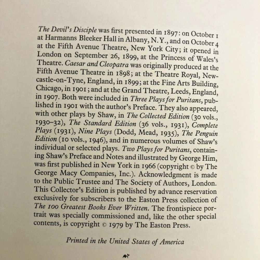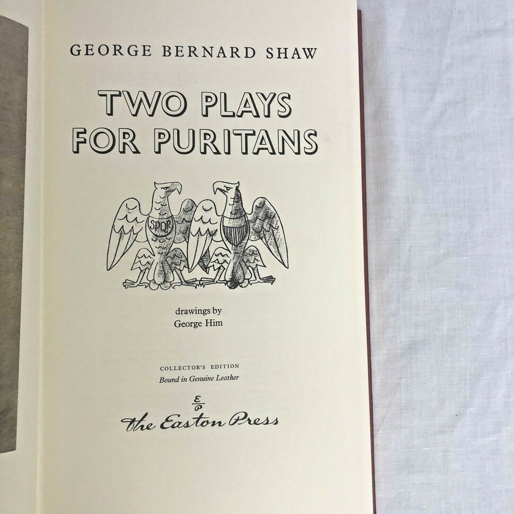 TWO PLAYS FOR PURITANS George Bernard Shaw Easton Press Greatest Books Written The book is like new, unread, and unused in near perfect condition with no missing or damaged pages. Binding is tight. Accented in 22kt gold, printed on archival paper with gilded edges, and concealed muslin joints. Bound In full leather. Clean and stored in non-smoking environment. Carefully packaged and quickly shipped.