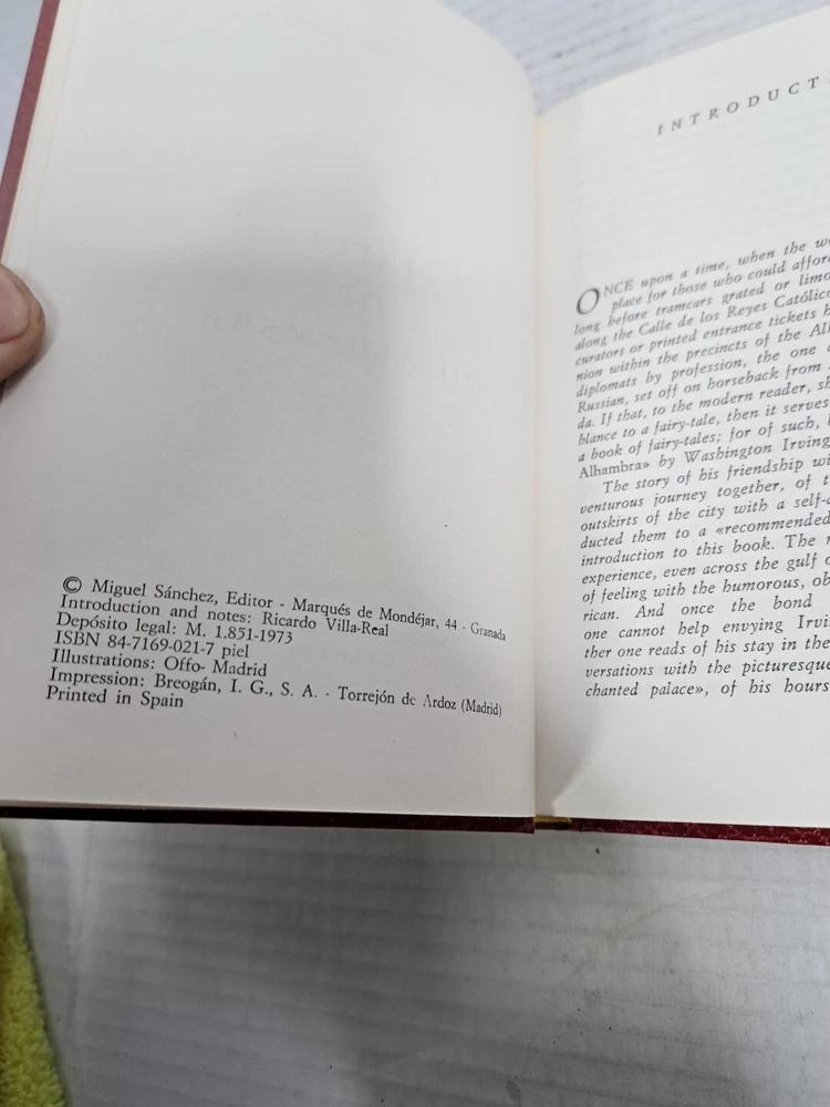 Delve into the captivating world of Washington Irving's "Tales of the Alhambra", a classic literary masterpiece filled with enchanting stories of myth, real historical events, and descriptive narrations. This 1973 original leather hardcover edition, published by Breogán, I. G., S. A., in Torrejón de Ardoz (Madrid), Spain, is adorned with beautiful color engravings by Offo from Madrid. Immerse yourself in the rich history and culture of Europe, particularly Spain, as you explore the pages of this unique collectible item. The book features special attributes such as illustrations and is written in English, making it a perfect addition to any book lover's collection.