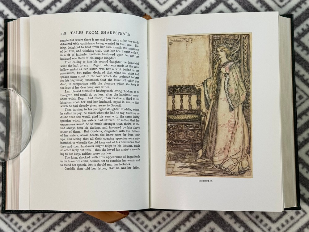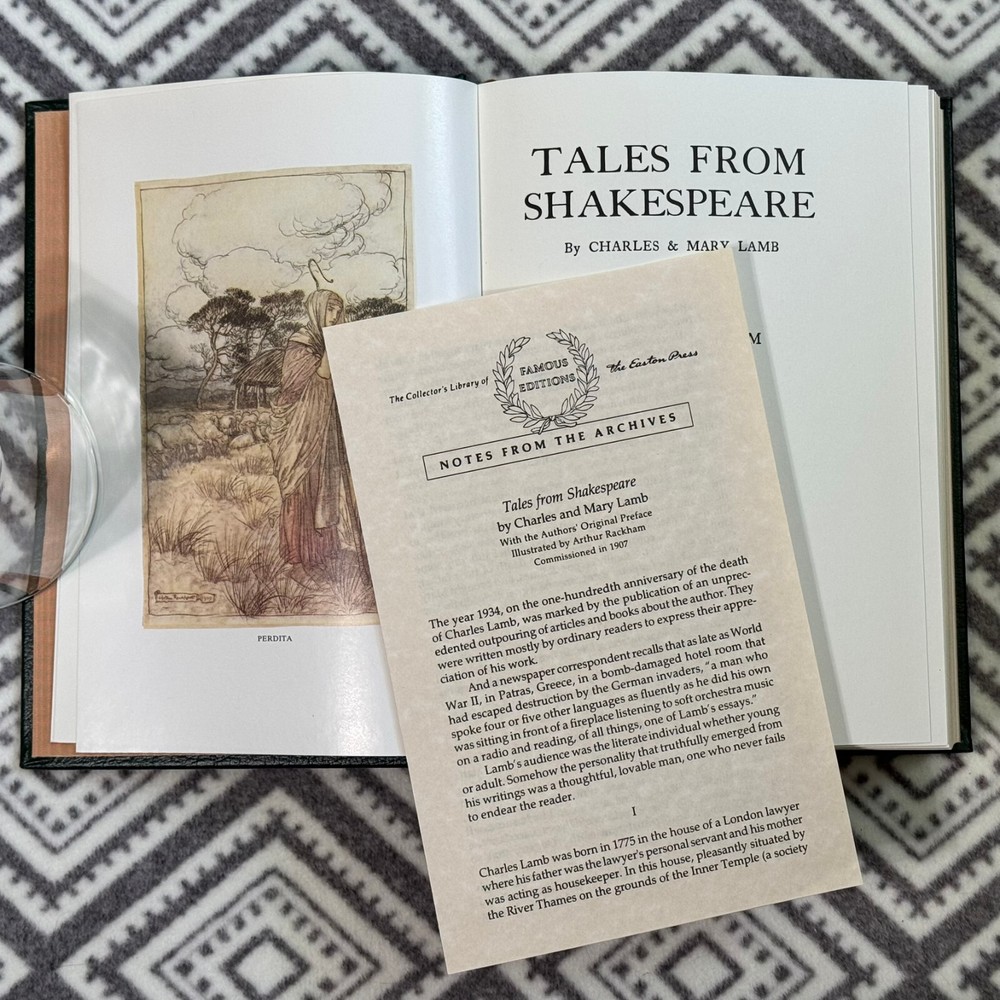 Easton Press Famous Edition Series - Tales from Shakespeare by Charles and Mary Lamb. Standard Easton Press book; leather-bound with 22kt gold accents, acid neutral paper, satin-ribbon page marker and sewn pages. No nameplates attached or unattached. Photos are of actual book. If you see other books or items in my store that you would like to purchase, I can combine shipping to save cost. Message me for details.