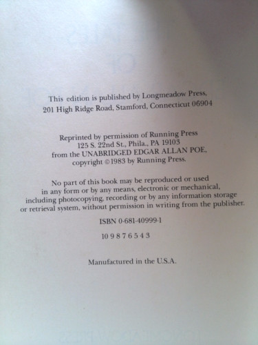Tales of Edgar Allan Poe (Leatherbound Classics Series) by Edgar Allan Poe Shelf and handling wear to cover and binding, with general signs of previous use. Boards have light shelf rubbing with scuffing and bumping as well as light tearing. Rear cover has sticker remnants. Binding is shaken with a cracked and exposed gutter. Endpages have light smudging. Page edges have light scuffing and smudging. Interior pages are lightly smudged with age-toning. Secure packaging for safe delivery.