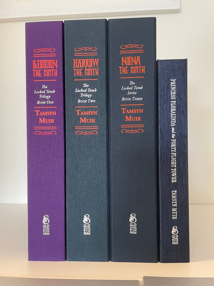 Matching lettered, Tamsyn Muir set, published by Subterranean Press. Gideon the Ninth Signed and lettered K/26 Harrow the Ninth Signed and lettered K/26 Nona the Ninth Signed and lettered K/26 Princess Floralinda and the Forty-Flight Tower Signed and lettered K/26 Comes with rights to the next Tamsyn Muir title Subterranean Press produces. Will be packed securely in a sturdy box, or two, with plenty of protection.