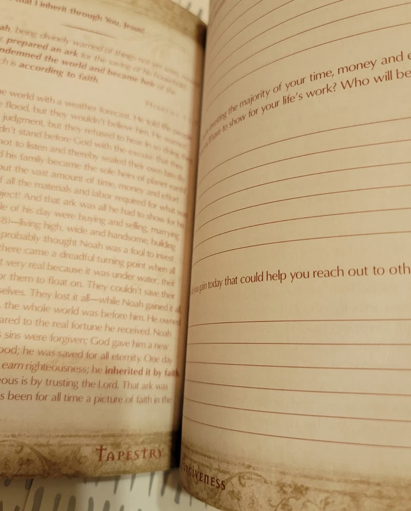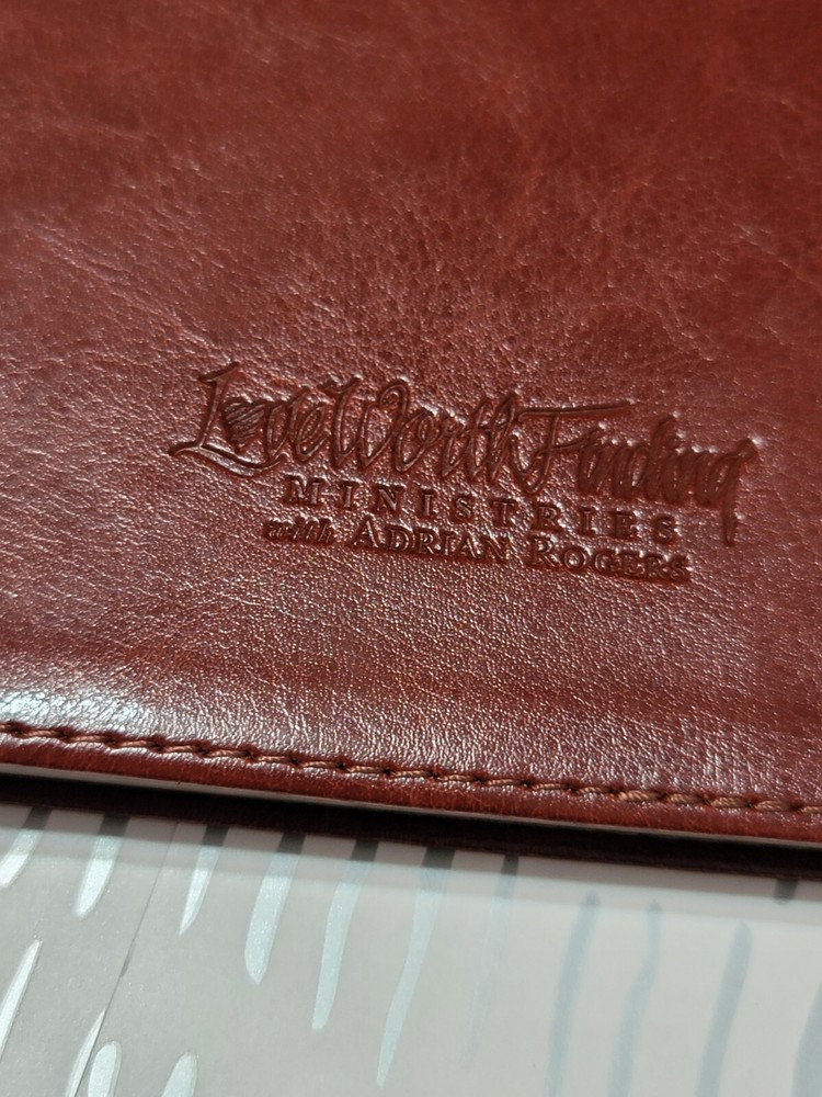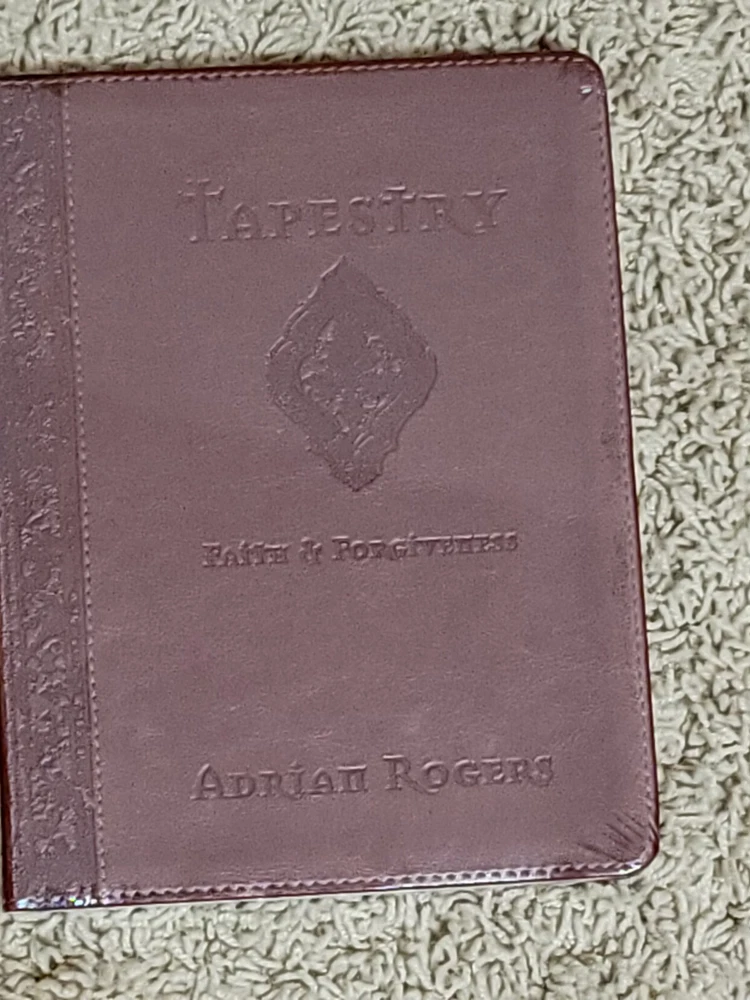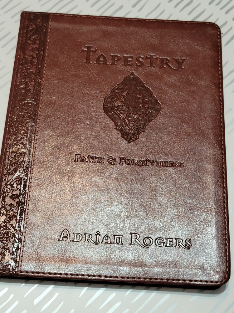 Tapestry Faith & Forgiveness Adrian Rogers was sealed opened to see pages 186 amount and date 2013 leather embossed cover Tapestry Collection size: 6.5" x 8.5" A book or subject in the Bible using Dr. Rogers' 5-step process for examining God's Word. You will learn that only by faith can we extend forgiveness to others, share God’s truth, and leave a godly legacy When we come to Him in repentance and faith, we are empowered-and expected-to live the Christian life not by trying, but by trusting. Faith is not only how we receive salvation, it is how we walk, day by day, in grace. Only by faith can we extend forgiveness to others, share God's truth, and leave a godly legacy. As the tapestry of your life unfolds, may you begin to see the wonders of living each day, moment by moment, a life of faith and forgiveness. A leather-bound journal with 90 devotionals from Adrian Rogers on the struggle with pain and suffering. Room with each entry to write your thoughts. Last 2 photos showing it was sealed