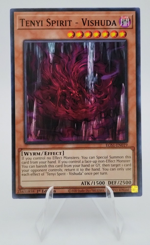 Tenyi Spirt-Vishuda 1st Edition EGS1-EN019 Egyptian God Deck Slifer the Sky Dragon 2021 Yu-Gi-Oh Card Cards in Near Mint (NM) condition show minimal wear from shuffling, play or handling and can have a nearly unmarked surface, crisp corners and unblemished edges outside of a few slight flaws. A Near Mint card may have slight edge wear or a scratch or three, but overall look nearly unplayed with no major defects. The acceptable range of cards within the Near Mint condition includes both cards with no imperfections and cards with a few slight imperfections.