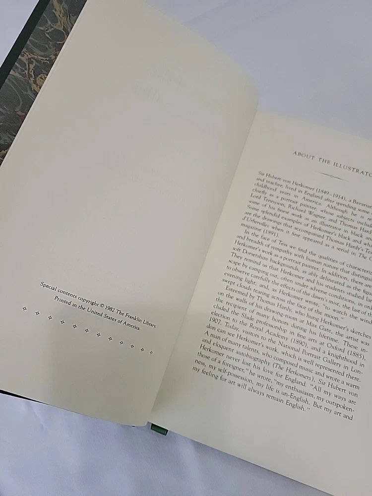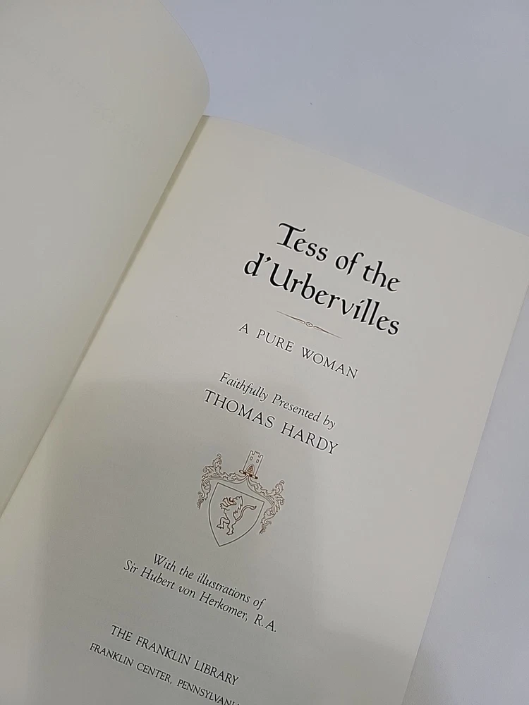 The product is a leatherbound 1982 edition of "Tess of the D'Urbervilles" by Thomas Hardy, published by Franklin Library. It is an English language classic literature book that falls under the category of Antiquarian & Collectible. This original edition is part of the Franklin Library collection and features leather binding, making it a desirable piece for book collectors and fans of Thomas Hardy's work. Like new condition.
