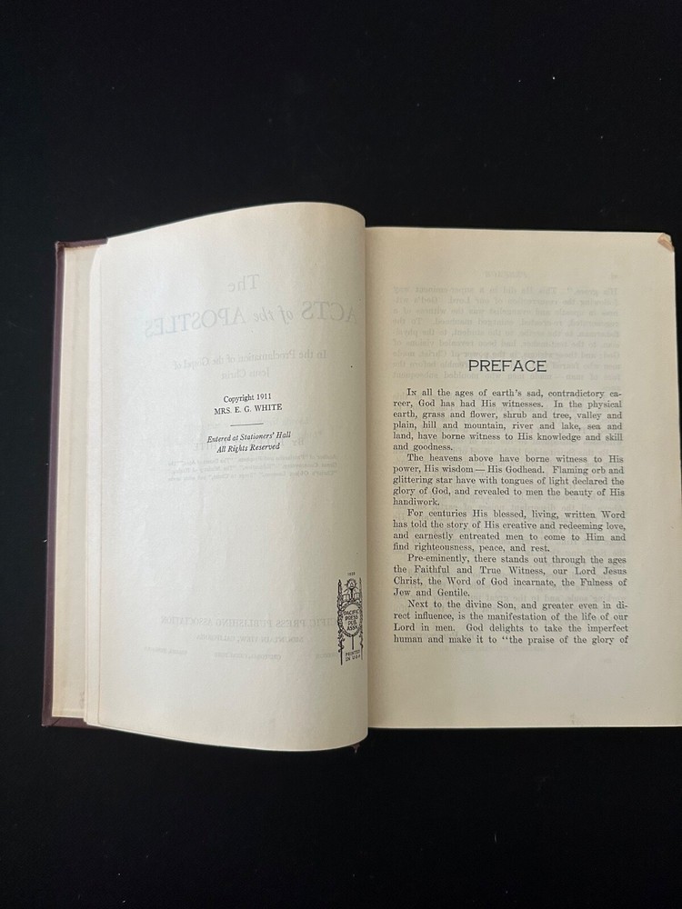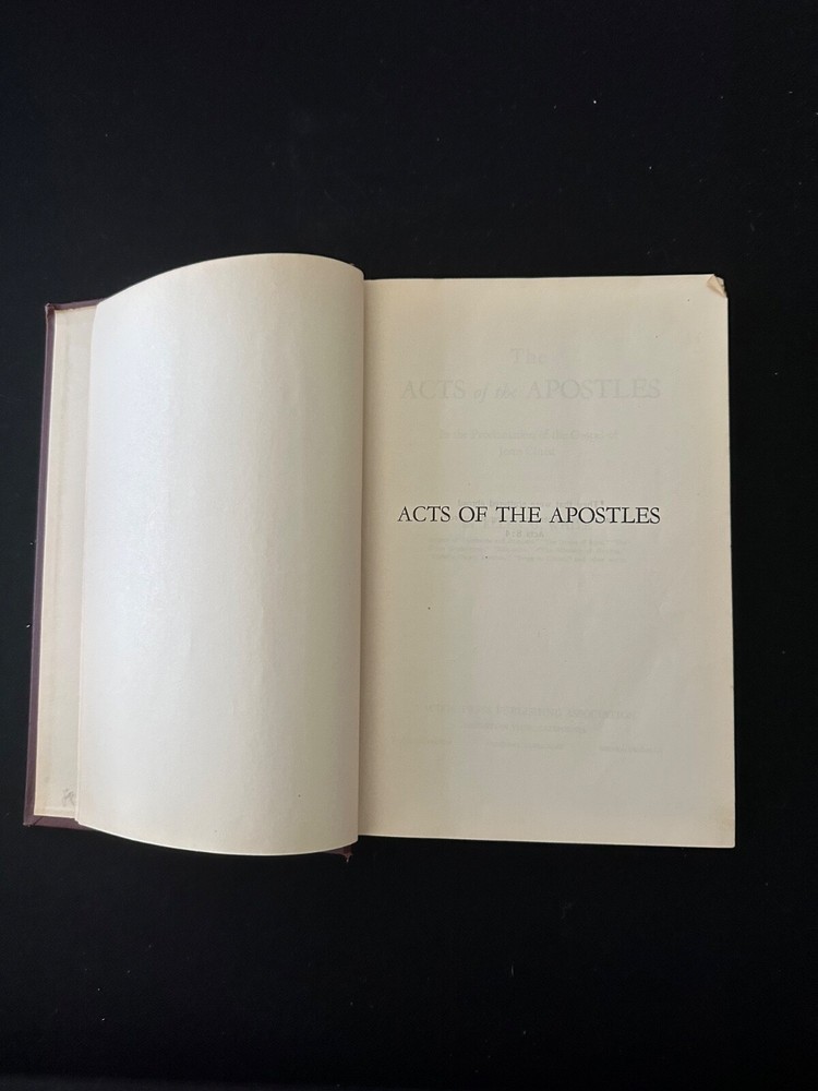 "The Acts of the Apostles" by Ellen G White, published in 1911 by Pacific Press Publishing Association, is a limited edition faux leather hardcover book part of the "Conflict of the Ages" series. This nonfiction Christian book, aimed at adult readers, provides illustrated narratives about New Testament characters and stories from Acts. With 633 pages, this vintage book serves as a valuable resource for those interested in religious and spiritual topics from the early 1900s, offering a unique perspective on the teachings of Ellen G White.SOME BOOKS MAY HAVE WRITING AND MARKING IN THEM.