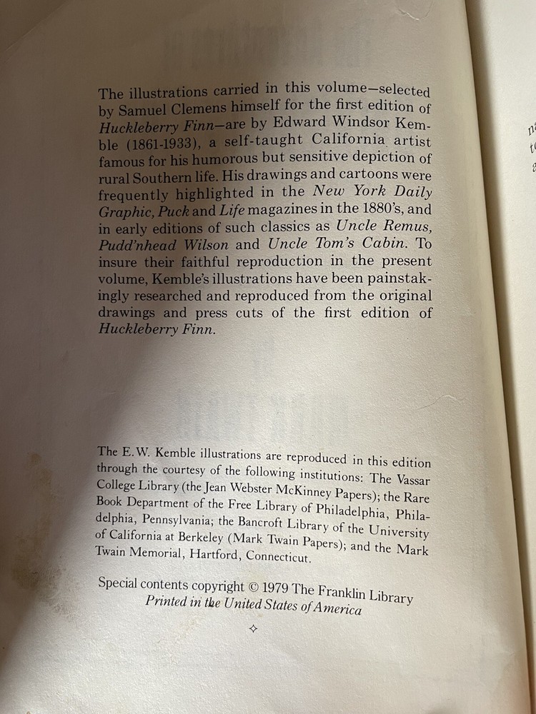 The Adventures of Huckleberry Finn by Mark Twain Franklin Library Leather Bound. 1979 Gold trimmed pages, some wear and tear-sold as is.