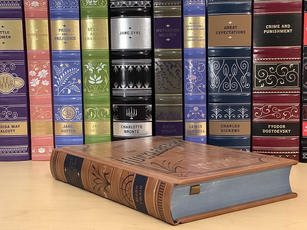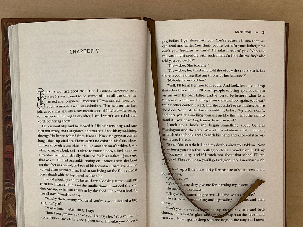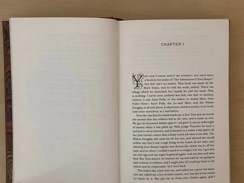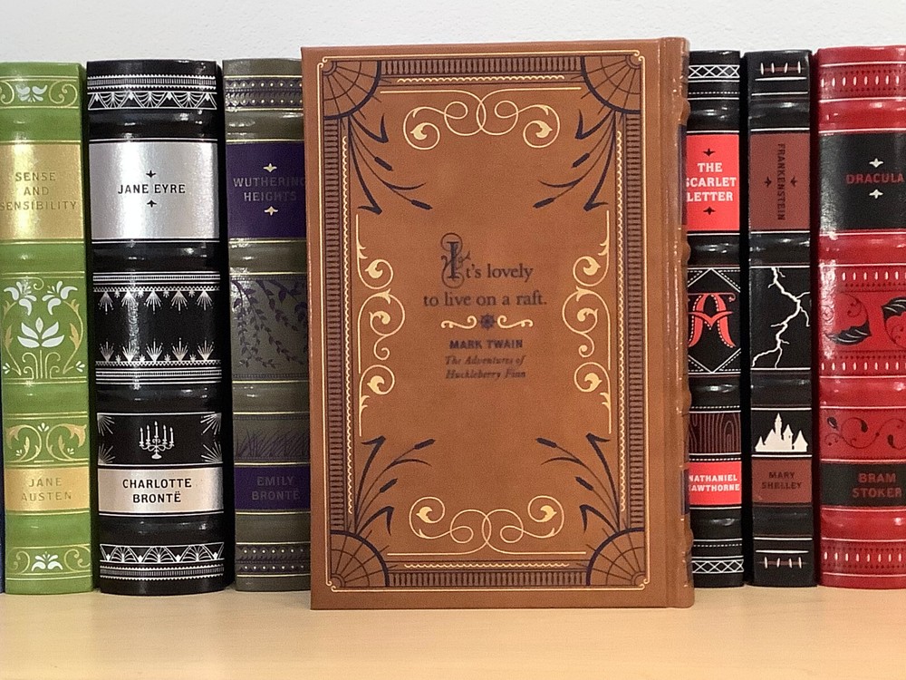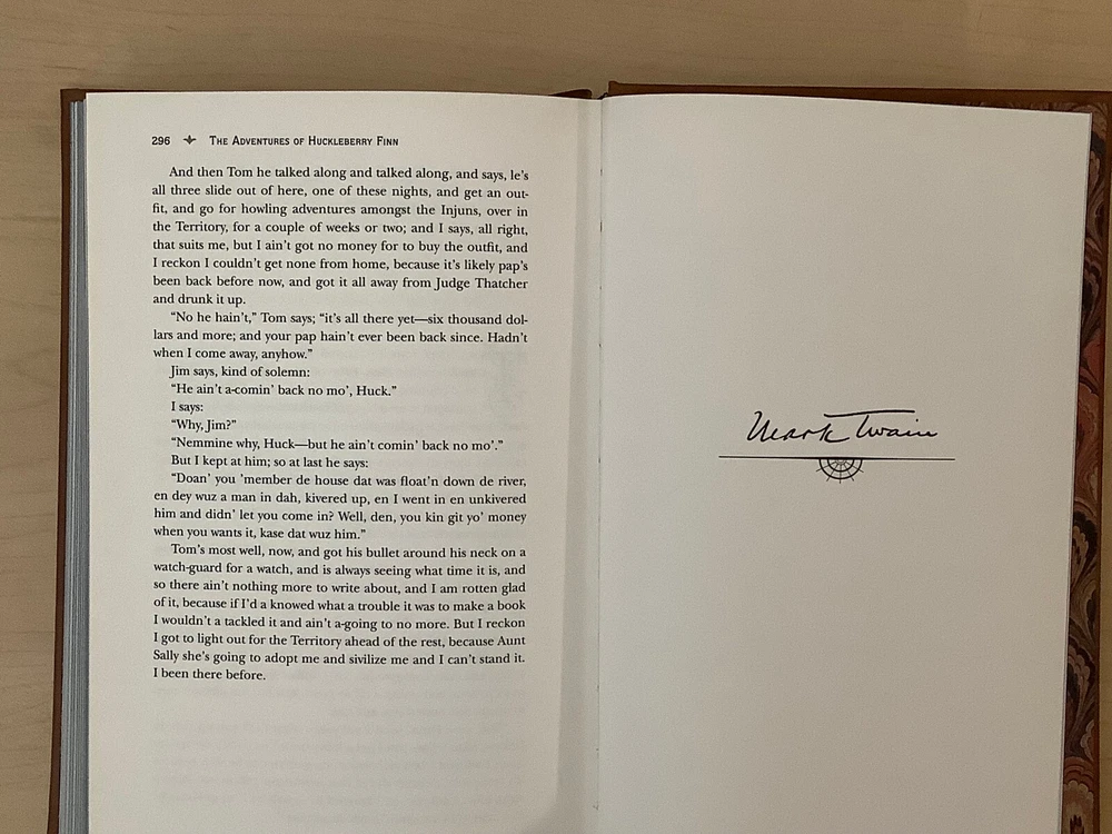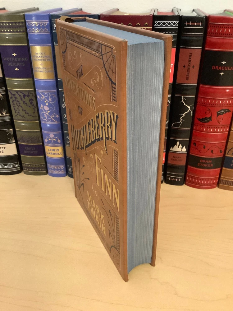 The Adventures of Huckleberry Finn by Mark Twain bound in leather, with colored edged pages and a ribbon marker Item Condition: This is a leatherbound hardcover in Very Good condition. There are no names, bookplates or stamps of previous owners inside. The binding is tight, and the pages are clean with some minor wear / marks to the edges. The leather is in nice condition with light rubbing to the corners and spine. Dimensions are approx: 8.5" x 5.75" x 1.25" This book will ship in a box with bubble wrap. Photos are of the actual book that will be shipped .