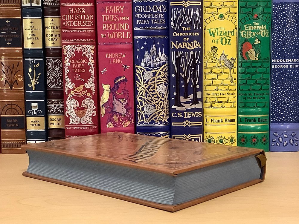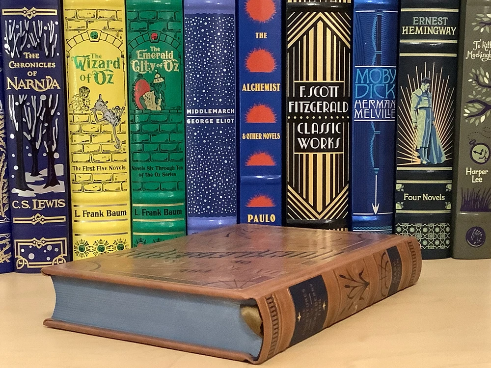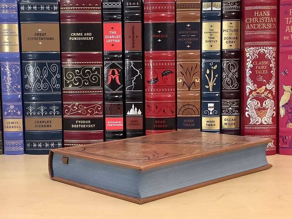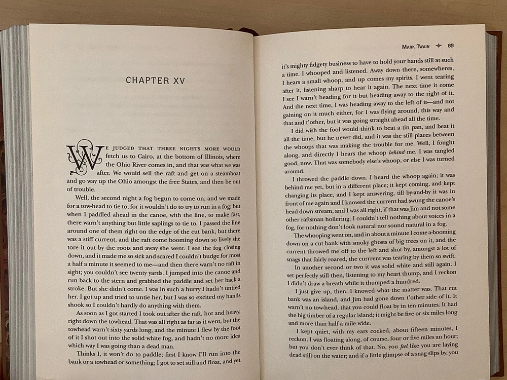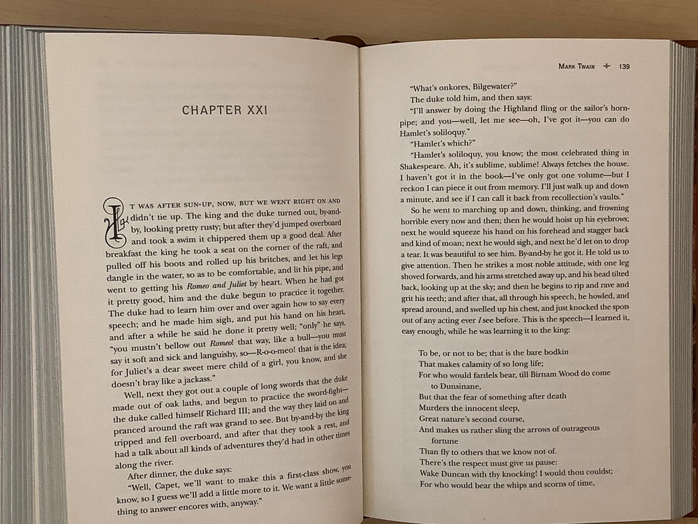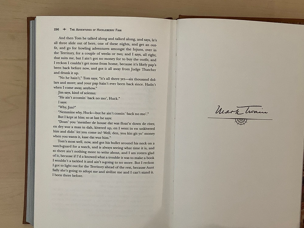 The Adventures of Huckleberry Finn by Mark Twain bound in leather, with colored edged pages and a ribbon marker Item Condition: This is a leatherbound hardcover in Very Good condition. There are no names, bookplates or stamps of previous owners inside. The binding is tight, and the pages are clean with some minor wear / marks to the edges. The leather is in nice condition with light rubbing to the corners and spine. Dimensions are approx: 8.5" x 5.75" x 1.25" This book will ship in a box with bubble wrap. Photos are of the actual book that will be shipped .