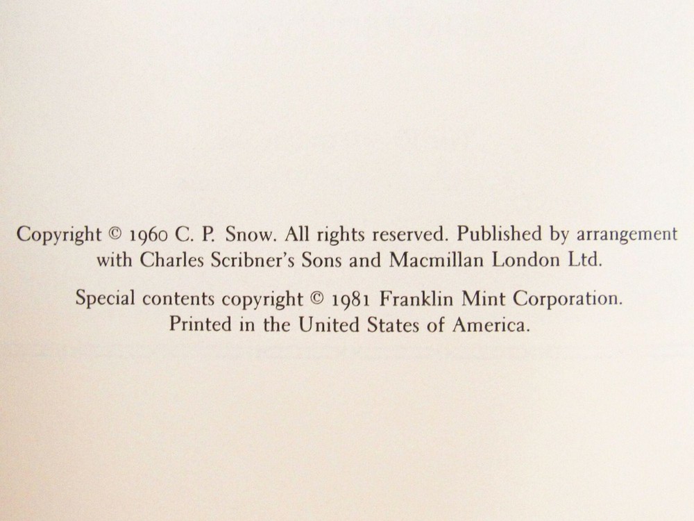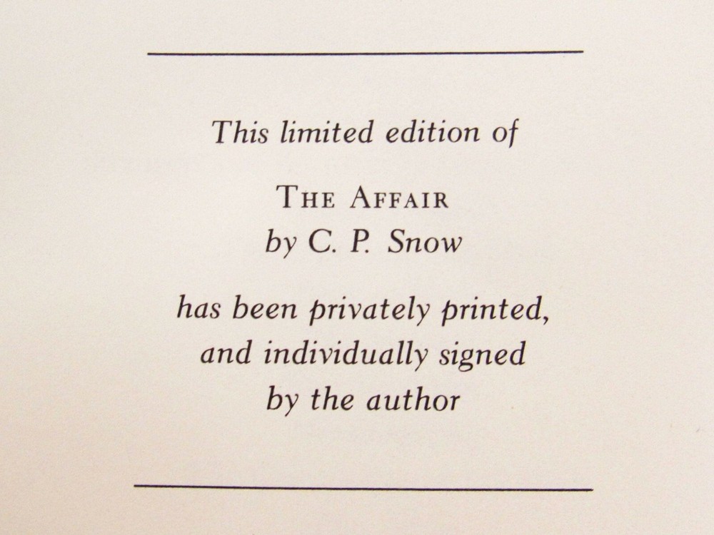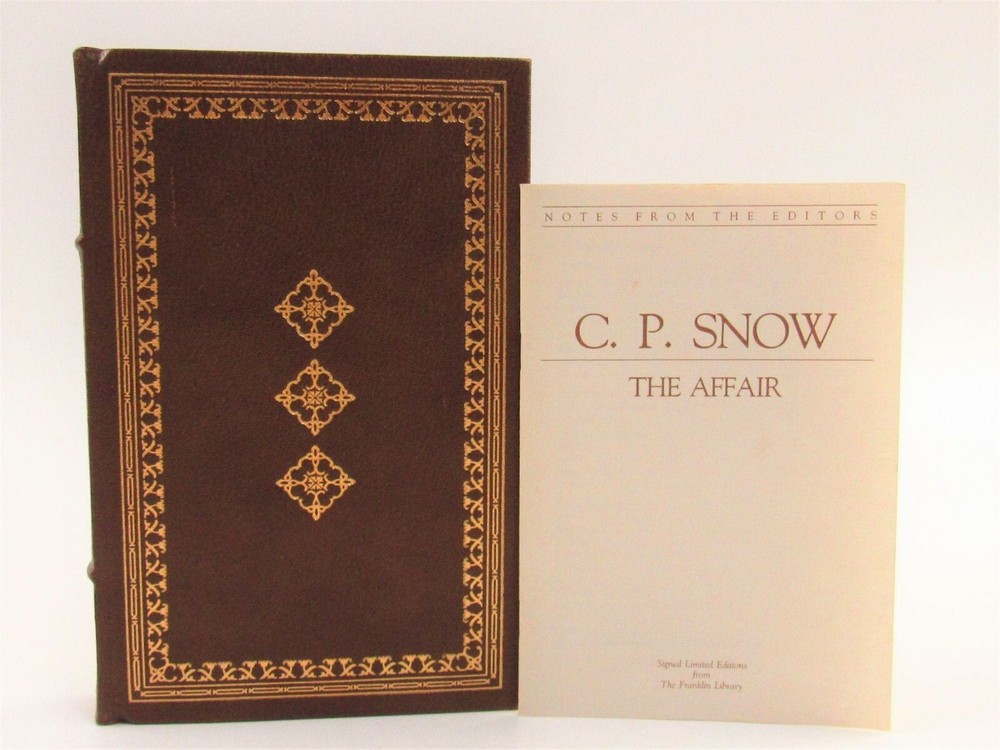 Franklin Library The Affair by C.P. Snow. Signed Limited Edition bound in brown leather with notes from the editors. A128 Very good, no notable wear • Made in United States of America Brief note about doing business with us: The items in our store come from a variety of places. Some are treasures we have collected and curated over many years. Others are from various clients that we assist in liquidating an estate or downsizing from a large home into a smaller living arrangement. We do research our offerings and will give you the best information available regarding manufacturers, patterns, styles, age, etc. We are not experts on everything we handle and if we do not know the correct information, we will note in the description that it is “unknown”. Some items are cleaned and reconditioned prior to listing in our store, others are left in “as found” condition and that will be noted. We do not always know if an item came from a smoker’s or pet owner’s home, if you have questions regarding a particular item, please feel free to contact us for more information. We are always happy to talk “shop” and share more detailed information on an item, if available. If you make a purchase with us and for some reason are not satisfied, please let us know! We do have a 30 Day Return policy. It does require you to pay return shipping and the item returned must be in the same condition as it was when we shipped it originally. We ship the majority of our items via USPS and use a combination of flat rate boxes and recycled boxes depending on the size and weight of an item. We work to find the least expensive, yet safe way to get the item(s) you have chosen from our place to yours. We will also combine shipping of multiple items purchased to save you on the shipping. We Ship within 1-3 business days after receipt of confirmed payment. Thank you for considering Daisy Lane Antiques, we look forward to serving you and helping you find that “perfect” piece for you or your special loved one!