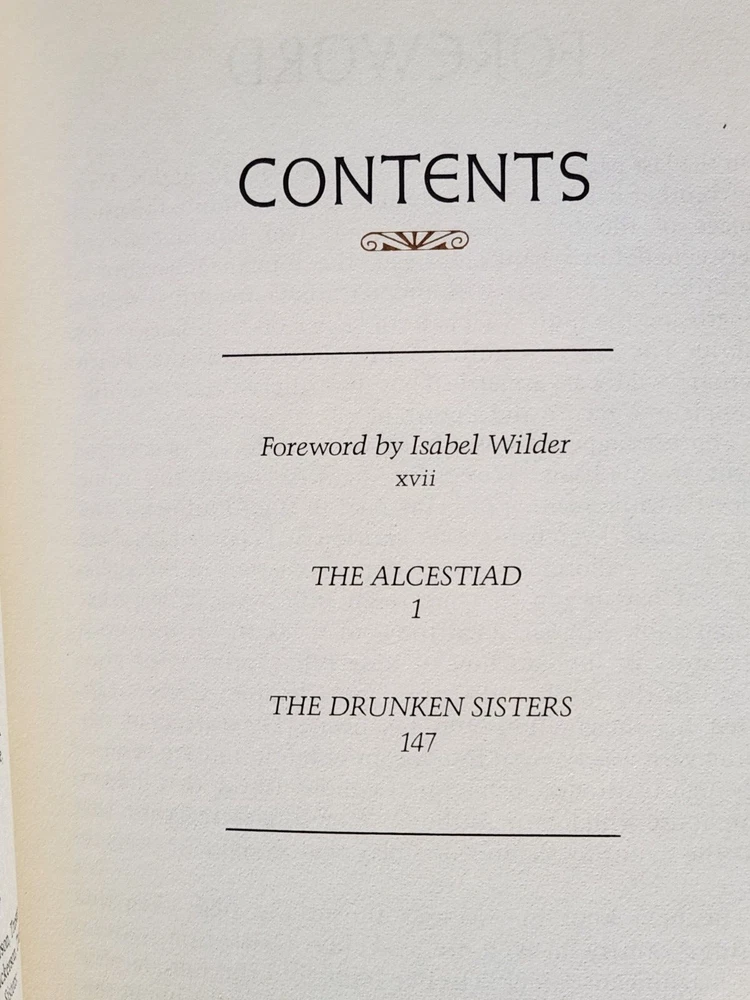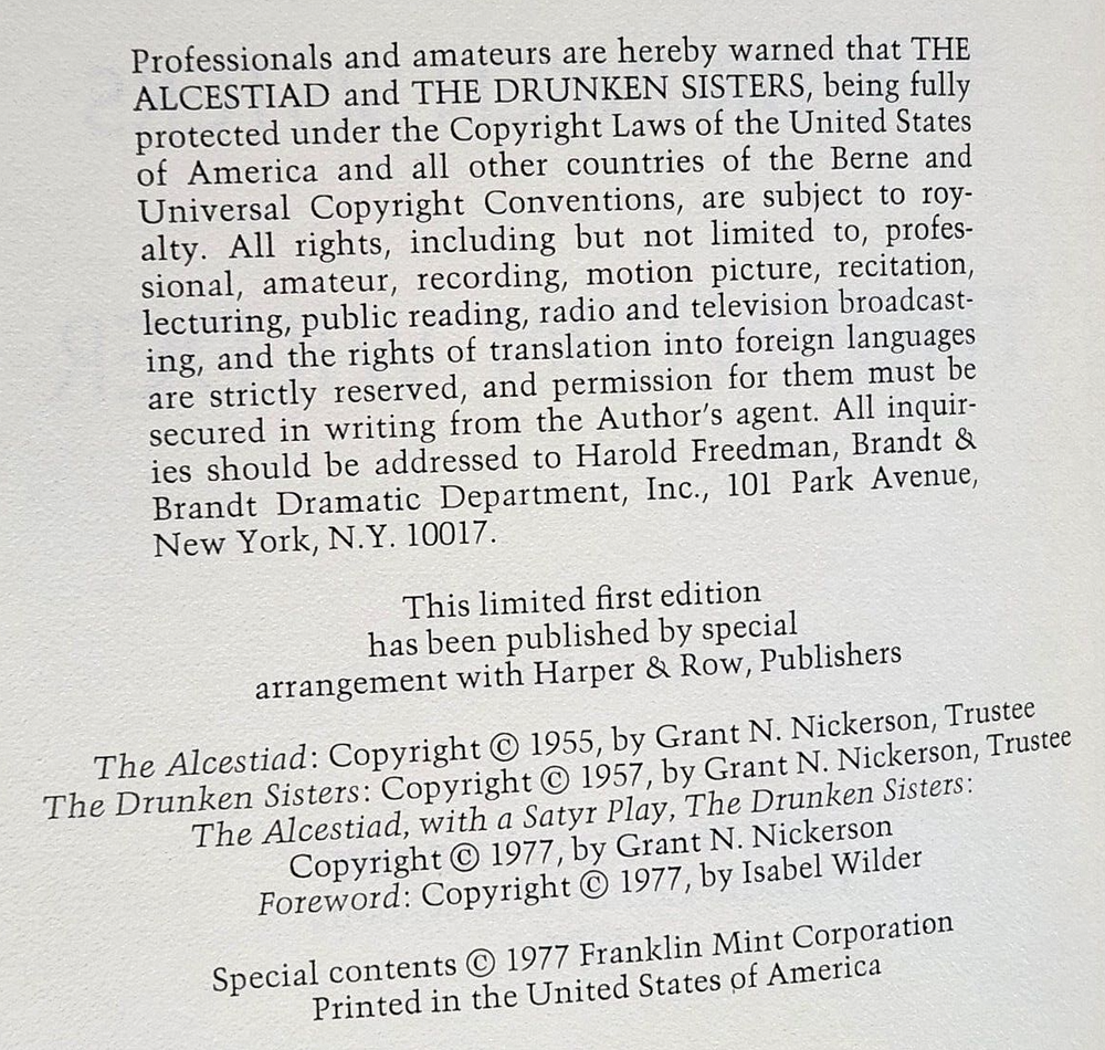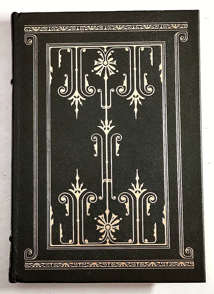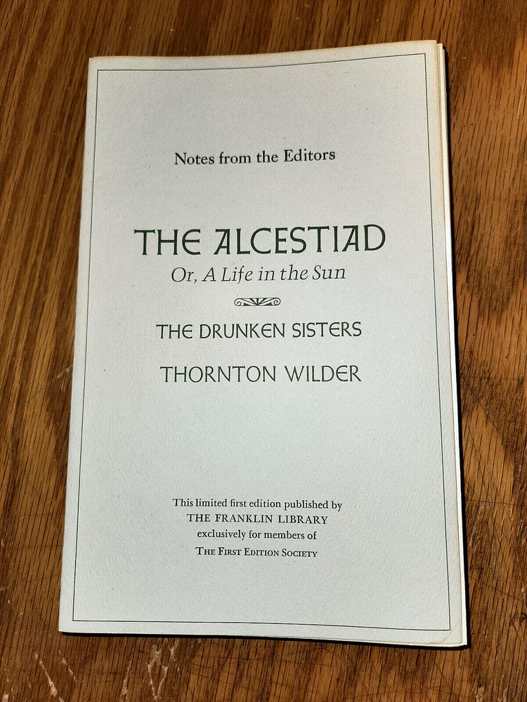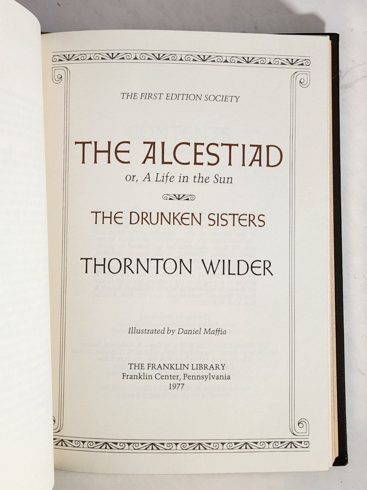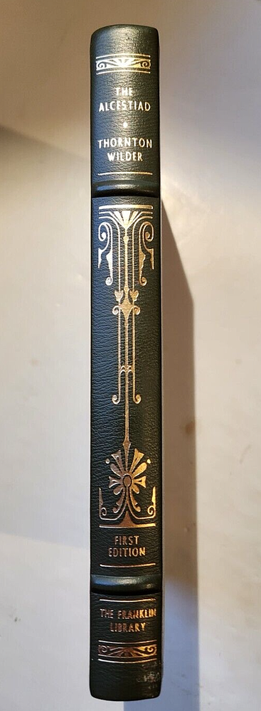 From the Franklin Library Collection. CONDINTION Silk endpapers show slight color fade at edge. All else new The Alcestiad Collected Short Plays Volume II Edinburgh Festival, 1955 Full-length Play Written in the tradition of early Greek tragedies, The Alcestiad tells the story of Admetus, King of Thessaly, his wife Alcestis, and the triumphs and tragedies they endure as favorites of the god Apollo. The extent of Apollo’s involvement in their marriage is further explored in Wilder’s accompanying satyr play, The Drunken Sisters. Leather Bound Gilt page edges Silk Endpapers Raised Bands Satin Bookmark Ribbon Accented in 22kt gold Limited edition First Edition Society Comes with “Notes from The Editors” Booklet. The Alcestiad: Or, a Life in the Sun / The Drunken Sisters Franklin Library Harper & Row, Pub. Leather Bound – January 1, 1977 by Thornton Wilder (Author), Elizabeth Wilder (Foreword), Daniel Maffia (Illustrator) Terminology that may be used in this description: Bookplate: Highly sought after by some collectors, a book plate is an inscribed or decorative device that identifies the owner, or former owner, of a book. Most often bookplates are affixed to the endpaper of a book. Bump: Indicates that the affected part of the book has been impacted in such a way so as to cause a flattening, indention, or light bending. Deckle Edge: Deckle edge is the feathered edge of a page. Traditionally and historically, this was a side effect of the process of making paper. Dust Jacket: Sometimes used as another term for dust jacket, a protective and often decorative wrapper, usually made of paper which wraps around the binding of a book Ex-library: A former library book, generally containing library acquisition and ownership stamped Markings, and other typical indications of the library's use. Foxing: Or, Foxed is the age related browning, or brown-yellowish spots, that can occur to book paper over time. When this aging process happens to the paper in a book it is referred to as "foxed". Remainder Mark: A remainder marked book is just that - a mark to the page edges of a book. This mark is placed on the page edges by a publisher as books are returned from bookstores or sold to discounters. Rubbing: Abrasion or wear to the surface. Usually used in reference to a book's boards or dust-jacket. Shelf Wear: (shelving wear) describes damage caused over time to a book by placing and removing a book from a shelf. Soiled: Generally, refers to minor discoloration or staining.