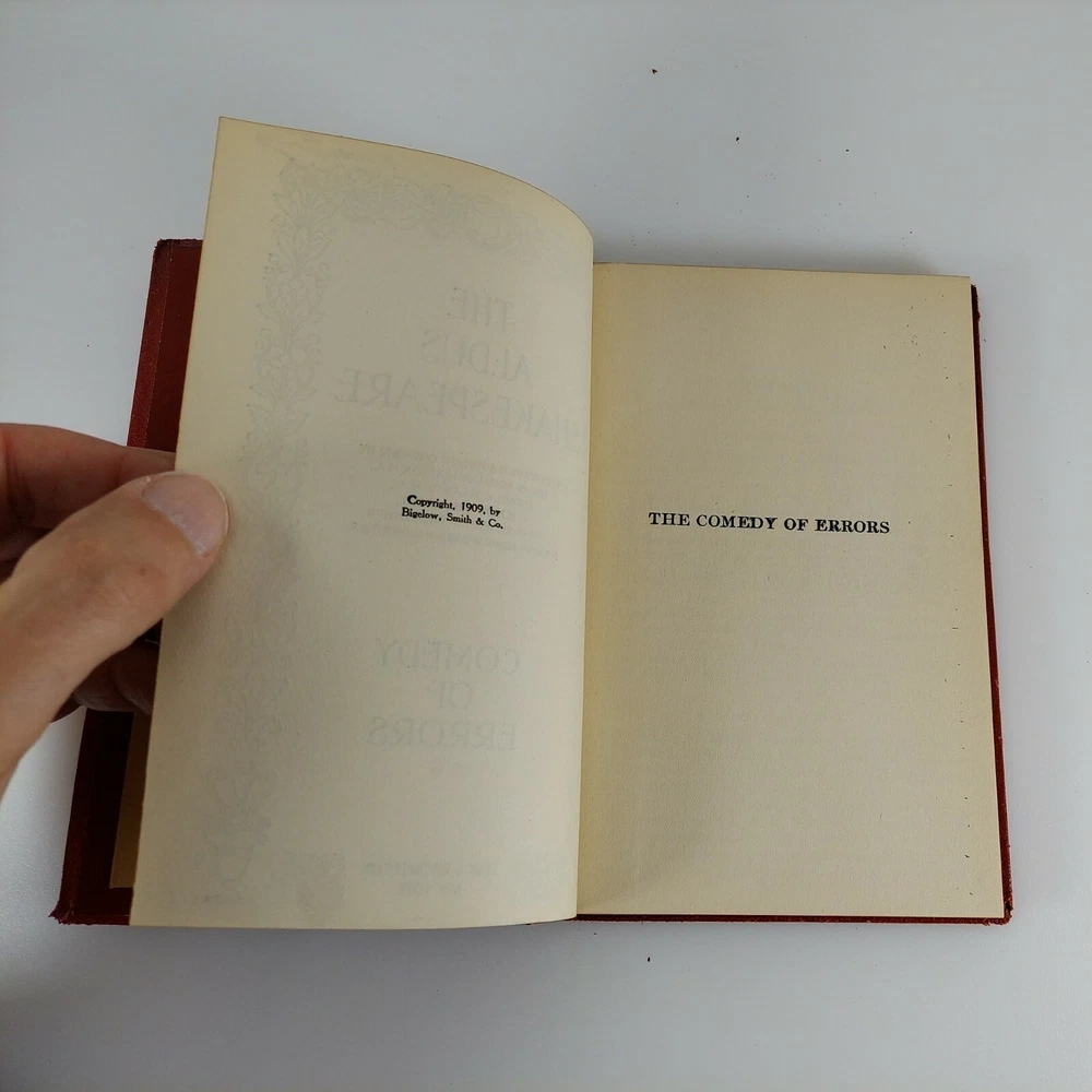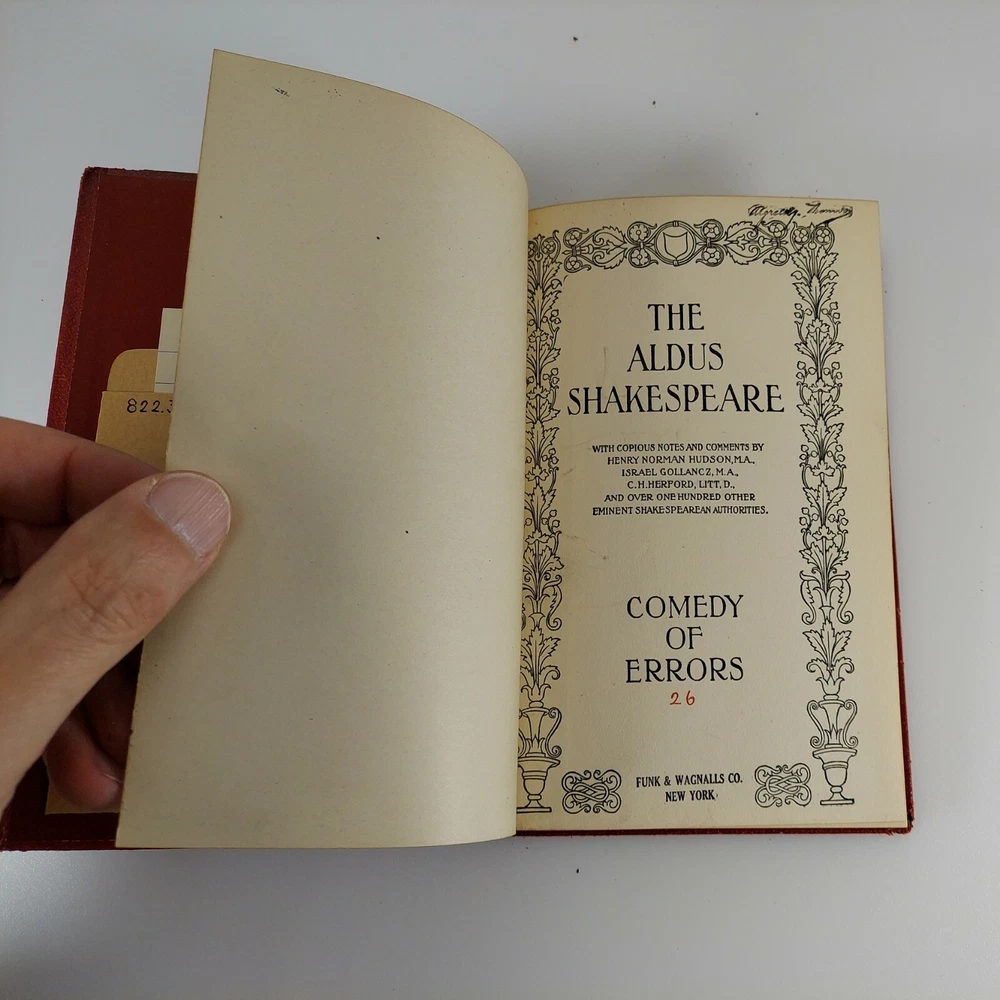 The Aldus Shakespeare Comedy of Errors, 1909 Funk & Wagnalls Leather Ex-Library. Condition is Acceptable with cover wear and tanning of pages as shown. Leather is flaking at corners and edges. Shipped with USPS Media Mail