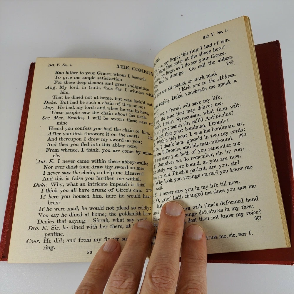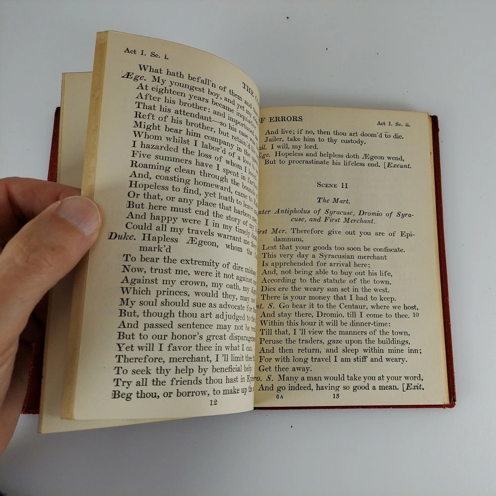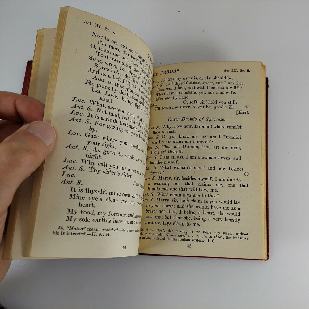 The Aldus Shakespeare Comedy of Errors, 1909 Funk & Wagnalls Leather Ex-Library. Condition is Acceptable with cover wear and tanning of pages as shown. Leather is flaking at corners and edges. Shipped...