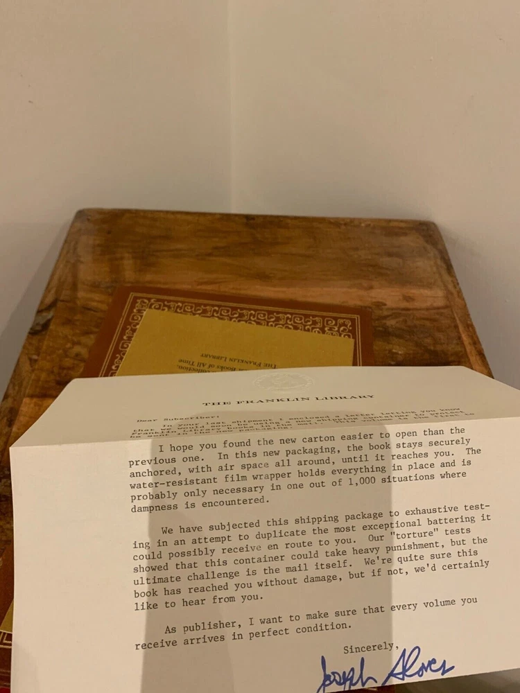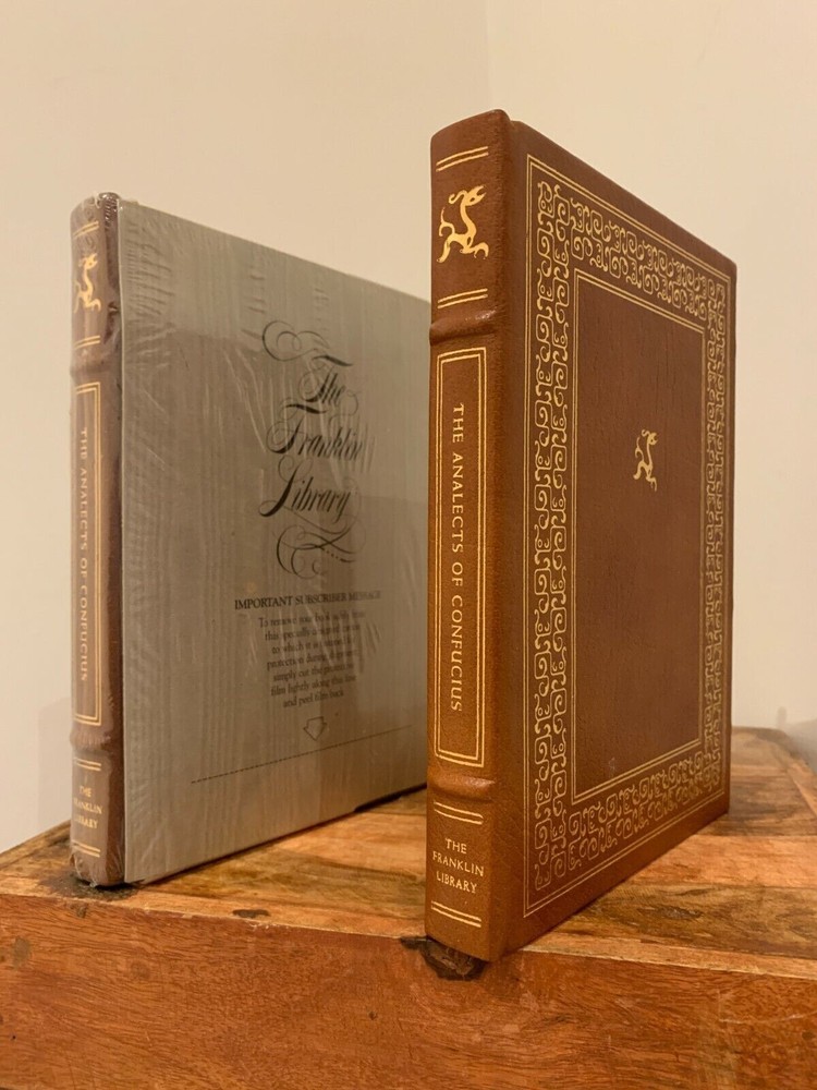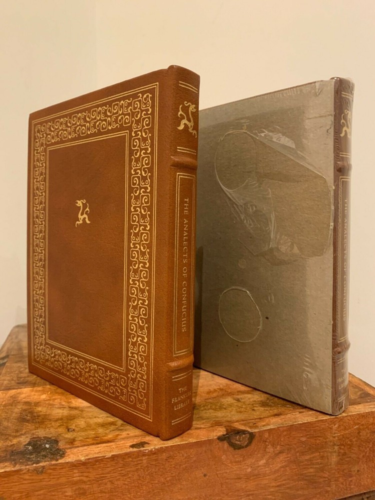 This is full genuine leather bound in new and sealed condition, never opened or read. The first photo includes my own copy shown here for exemplification only; also shown for exemplification only is the letter to the subscriber signed by John Sloves from the Franklin Library, in the last photo. The publisher’s notes booklet is also inside the plastic wrap. This book is the perfect find, perhaps the last one to be found in original wrapping. It laid in waiting for nearly 40 years to find its unique loving owner. 'The Analects of Confucius' by the Chinese ancient thinker Confucius is one of Franklin Library's ‘100 Greatest Books of All Time’, with wonderful attributes: •Fully and tightly bound in genuine leather. •22kt gold accents deeply inlaid on the "hubbed" spine and covers. •Heavy duty binding boards enhance the book’s durability. •Superbly printed on acid-neutral paper that lasts for generations. •Sewn pages – not just glued like ordinary books. •Handsome moiré end pages and a satin-ribbon page marker. •Gold gilded page ends. •Rigorous inspection at every stage ensured adherence to exacting standards and the highest quality. •Superb craftsmanship and commitment to quality. The appeal for collecting Franklin Library comes from having these attributes taken way further into the exquisite quality, durability and craftmanship, than Easton Press and Folio Society managed with their productions. This book is the perfect companion out on a park bench with a hot cup of coffee or snuggled up in front of the fireplace. Despite its all-inclusive nature it still feels very light and compact at a size of 2.5 x 15 x 22cm. Wonderful to hold and excellent reading experience.