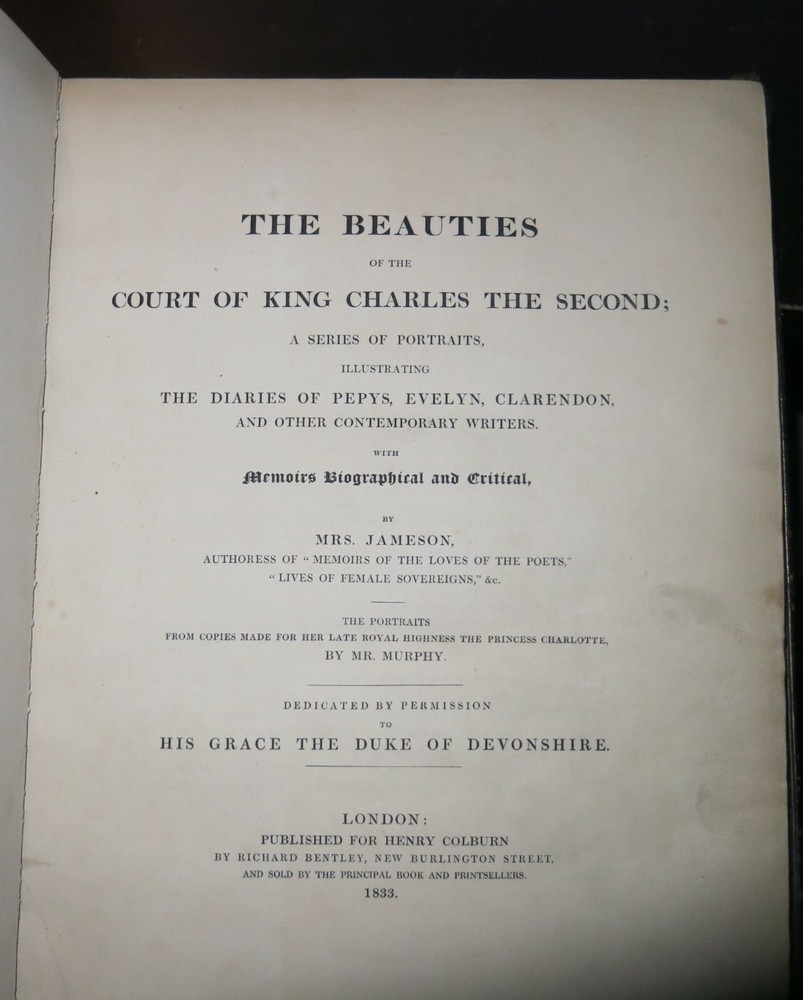 You are bidding on The Beauties of The Court of King Charles the Second, A Series of Portraits Illustrating The Diaries of Pepys, Evelyn, Clarendon, and Other Contemporary Writers, by Mrs Jameson , printed 1833 by Henry Colburn. 8vo, 221 p., with 21 portraits in total (including frontis). This is a VG- copy, with boards noticeably bowed, leather heavily rubbed especially along spine joints, faint smell of must to text block, heavy wrinkling to several pages, otherwise fairly clean and bright internally and a solid copy of a book which usually shows up in poor condition. Please email any questions and thanks for looking!