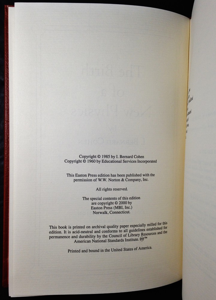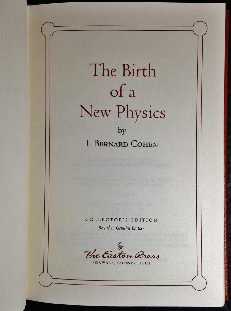 The Birth of a New Physics by I Bernard Cohen Part of the Science Classics collection of The Easton Press, Norwalk, Connecticut, 2000. This book is in excellent, unread condition. The Easton Press books are bound in genuine leather binding, with 22kt gold accents and hubbed spines, gilded page ends, acid-neutral paper, Moire fabric endsheets, and evocative illustrations and decorations. We will be happy to combine shipping, wherever possible. Some items cannot be combined because of their size, weight or because they are fragile. Please ask if you have any questions. Your order will ship by the next business day after receiving payment. All items are from a smoke-free environment. Thank you, and Happy Reading!