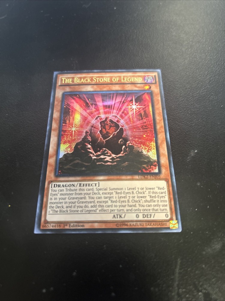 This listing will guarantee you a Near Mint, Ultra Rare, The Black Stone of Legend from Legendary Decks II. The card will be in a card sleeve, top loader and team bag. All of which will be placed inside a semi sturdy card and envelope then shipped. Yu-Gi-Oh - The Black Stone of Legend, LDK2-ENJ05, 1st Edition, Ultra Rare, Near Mint Legendary Decks II set description: Each set contains: A 40-card Deck based on Yugi's "Exodia the Forbidden One" and "Dark Magician", plus 3 Ultra Rare promotional cards (the tournament-legal versions of the Egyptian God cards) and an Ultra Rare Yugi Token card A 43-card Deck based on Kaiba's "Blue-Eyes White Dragon", plus an Ultra Rare Kaiba Token card A 43-card Deck based on Joey's "Red-Eyes Black Dragon" and Gemini monsters, plus an Ultra Rare Joey Token card 3 Secret Rare promotional cards: "Eternal Soul", "Dark Burning Attack", and "Dark Burning Magic". The Kaiba and Joey Decks each include the following: 3 Ultra Rare cards 40 Common cards 1 Token The Yugi Deck includes the following: 6 Ultra Rare cards 37 Common cards 1 Token