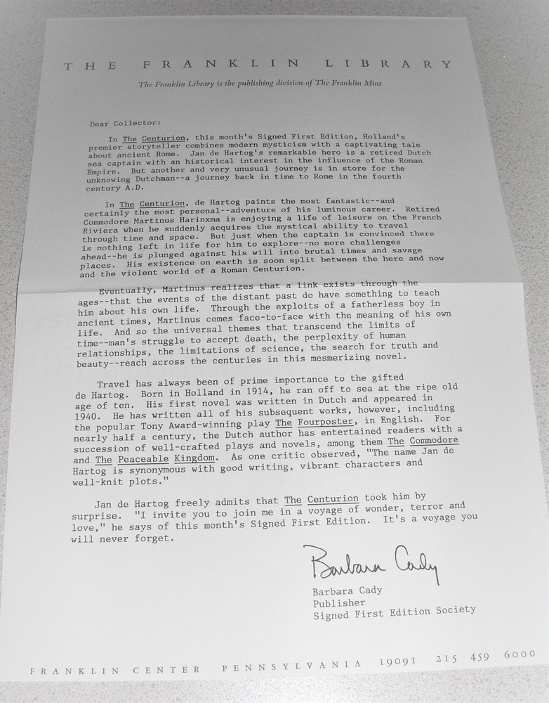 New and unread. A signed first edition by Jan de Hartog. It is leather bound with gold giltting on cover, spline and page edges. The book measures: 6 3/8"w x 9 3/8"h x 1 1/2"d. A retired Dutch sea captain with historical interest takes a journey back in time to Rome in the fourth century A.D. I have posted several additional contemporary first edition books, see my listings for details.