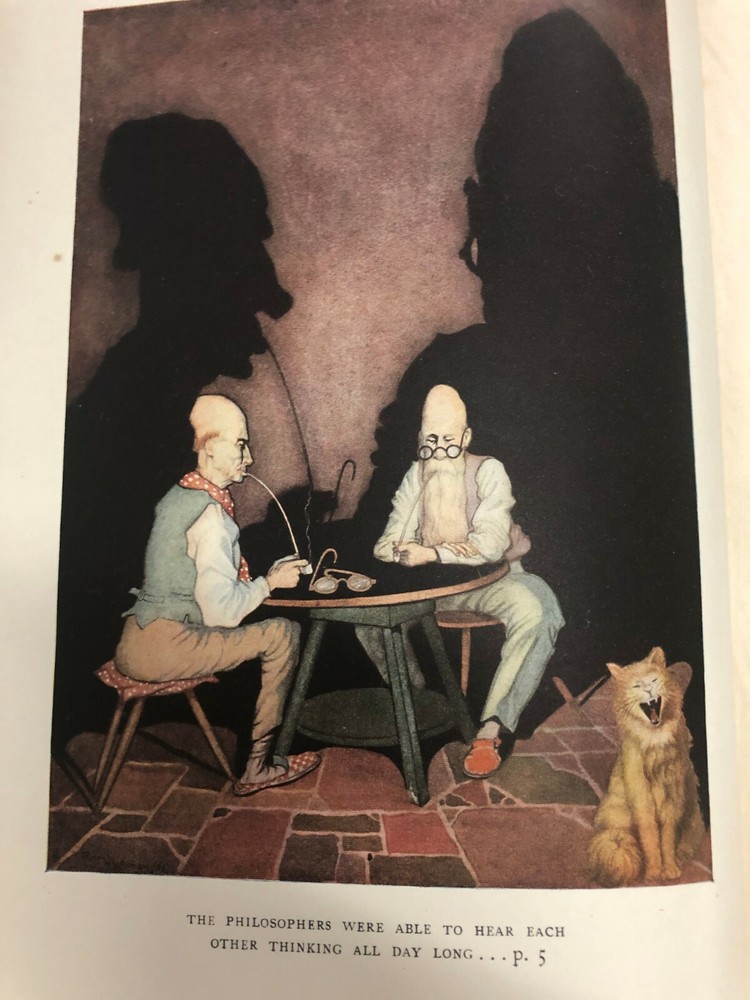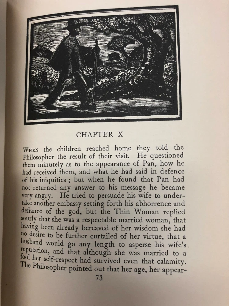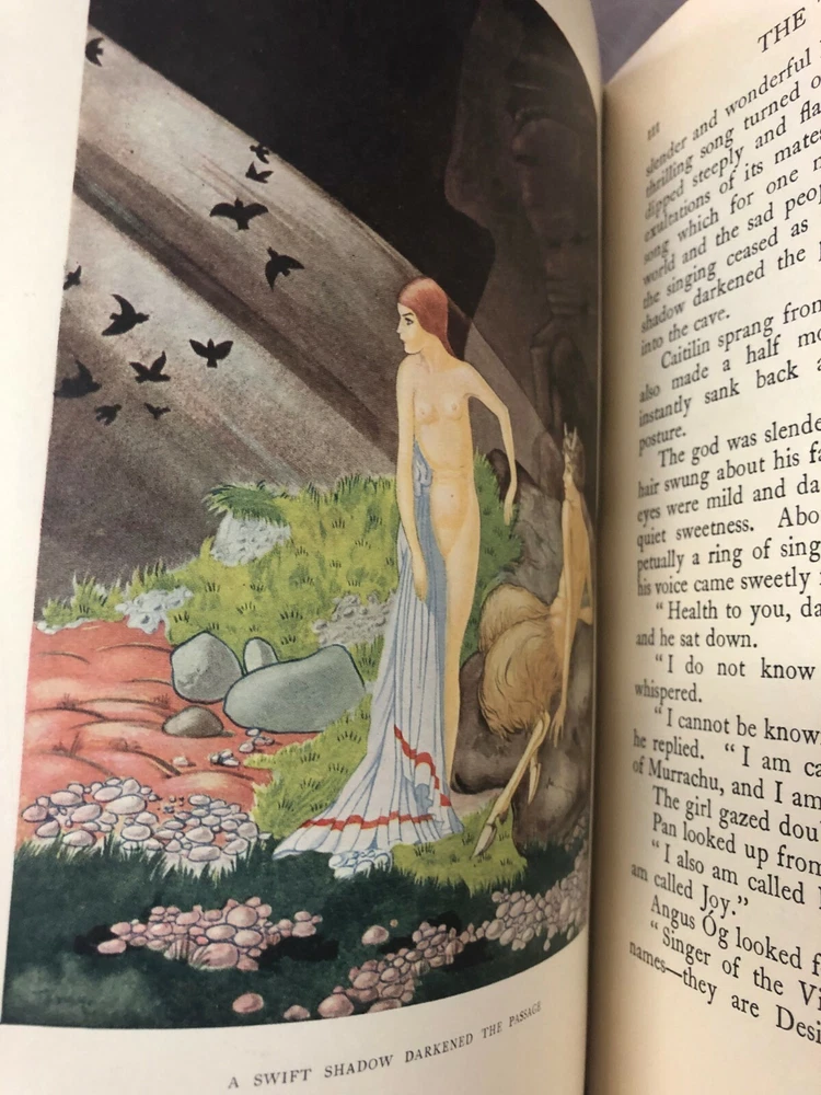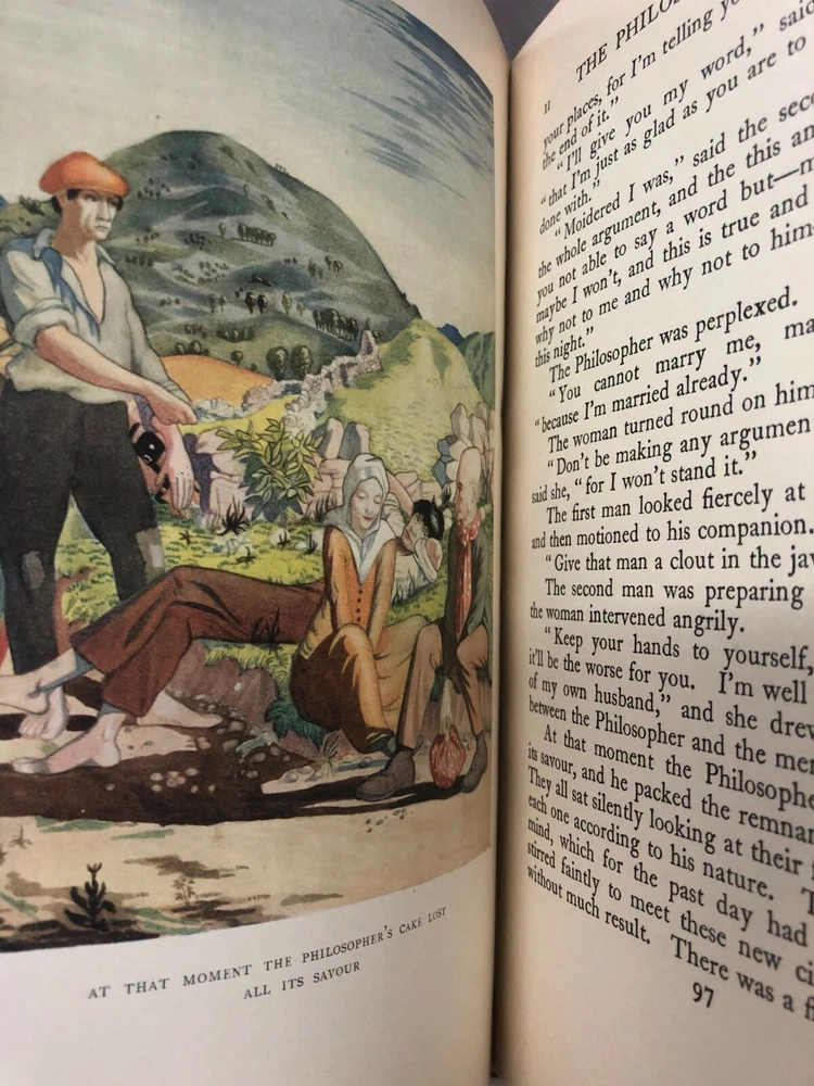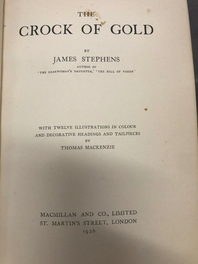 FIRST ILLUSTRATED EDITION. 8vo. (9.4 x 6.5 inches). Twelve full colour plates and 31 mono wood block illustrations as head and tail pieces. Finely bound in a beautiful 3/4 tan Morocco binding by Bayntun (Riviere) of Bath. Spine with five raised bands, each with gilt decorations. The compartments are lettered, decorated and ruled in gilt. Marbled endpapers, gilt inner dentelles. Top edge gilt. Light foxing on first few pages. A fine leather bound copy of this wonderfully illustrated edition. James Stephens was an early 20th century Irish poet and writer. His humor and lyric writing style are a wonderful addition to the retelling of Irish fairytales. His novels A Crock of Gold and Etched in Moonlight are also based on Irish fairytales. The Crock of Gold is an adult fairy tale. First published in 1912 this Irish tale tells the story of two philosophers who live together in a pine tree. They are entangled in a strange feud with a group of leprechauns.