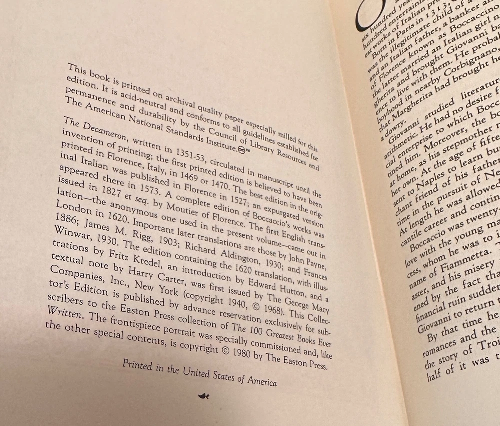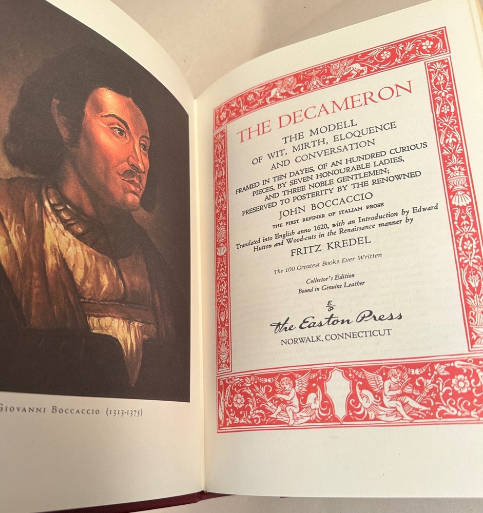 Memories for Sale! Helping you to 'remember when' and live it again! ***** The Dacameron, John Boccaccio, Easton Press 100 Greatest Books, Limited The Dacameron, John Boccaccio, Easton Press 100 Greatest Books, Limited, Leather-bound, embossed gold lettering and design and page edges, refractive inner page with unused Easton Press Ex Libris sticker and ribbon page marker. 536 pages, 7.25” x 10.25” format, 1.75” thick. Illustrated by Leonard Baskin. Copyright 1980. In new, unread condition, stiff spine, minimal shelf wear. Our Easton Press Books come from a person who only collected them, never read or marked the Ex Libris sticker. 4LBS We combine shipping prior to paying! Request an invoice when ready combine shipping! Check our eBay store for items of similar interests! ***** .