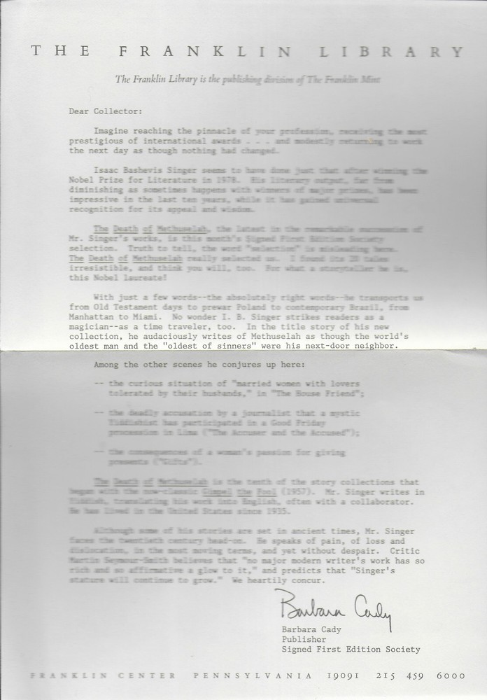 T h e Death of Methuselah by Issac Bashevis Singer Signed 1 st Edition Franklin Librar y, A Collection of 20 Short Stories, with an illustration by M ark P enberthy Franklin Library , Franklin Center, PA published the book, special contents copyright 19 8 8 . The book is part of Franklin Library’s series The Signed First Edition . The author signed the front flyleaf. The interior , beautiful leather cover, decorated end papers, and attach bookmark are in f ine condition. There are no marks, tears, or bookplates . The page edges are richly gilded. The book is 6 1/ 4 ” x 9” and 244 pages. Laid in the front, is The Franklin Library Letter for this title. Combine Shipping Discount!!!!! Save money when you buy more than one item (lot) from us! Except in rare cases, s & h to a U. S. address via media mail in the same box is $1.35 for each additional book. eBay may automatically send a combine invoice with the wrong s & h. Please wait to pay until you receive my combine invoice with the correct s & h. PLEASE CHECK OUT MY eBAY STORE AND OTHER AUCTIONS!!! 142025112025