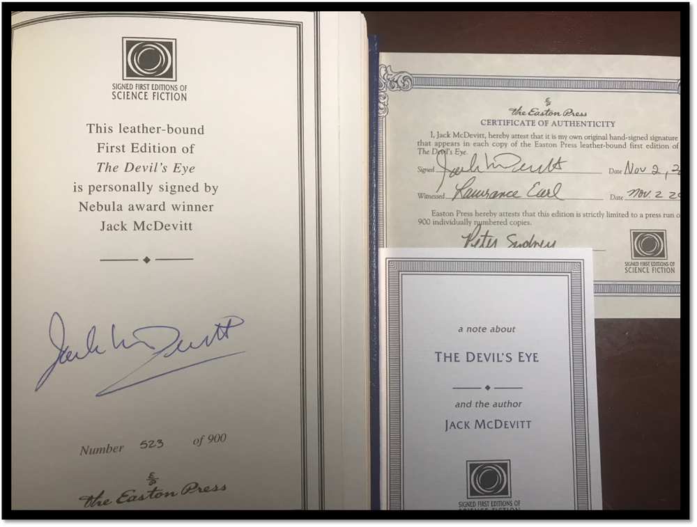 The Devil's Eye Signed 1st Edition This is a like new leather-bound Easton Press 1st edition of The Devil's Eye (Alex Benedict Series) Signed by Jack McDevitt. Interstellar antiquities dealer Alex Benedict and his assistant Chase Kolpath travel to the most remote of human worlds and uncover a secret connected to a decades-old political upheaval-a secret that somebody desperately wants hidden. SHIPPING I ship via media mail within the U.S. If you would like an expedited option please let me know before buying. I ship globally, but I use the U.S. service which I ship to in Kentucky and it ships out to the Country and uses their services. Also, if you are an international buyer and would like to combine shipping and the add to cart and request total option is not working please contact me about creating you a listing.