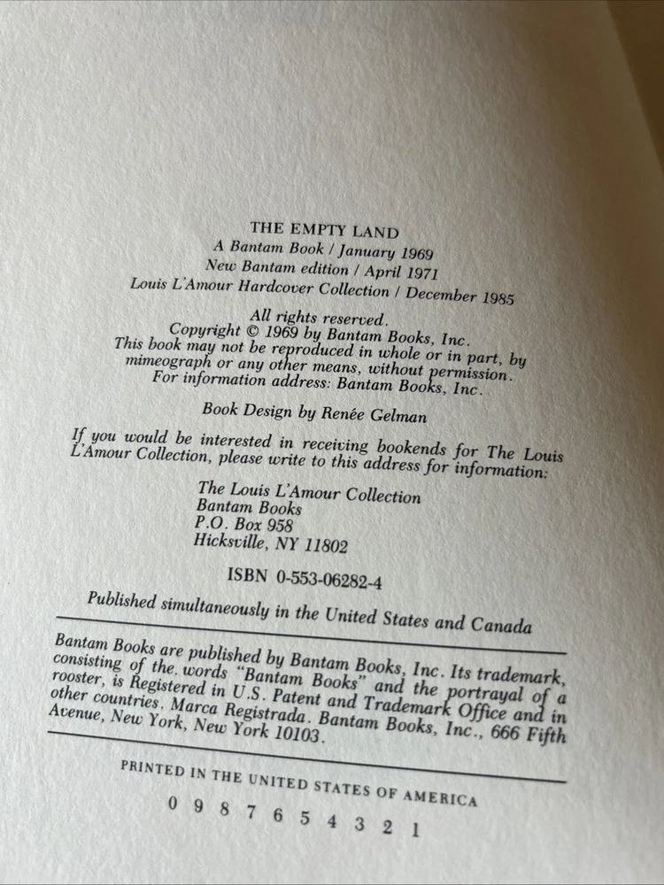 Great condition. See photos. Will combine shipping on multiple orders. Just let me know. The Empty Land by Louis L'Amour is a captivating fiction novel in the Western genre. Published by Random House Publishing Group in 1985, this hardcover book is part of The Louis L'Amour Collection. The book features a faux leather bound and has 164 pages. The novel is written in English and is intended for adults. It has a length of 5.25 inches and a height of 9.375 inches. The book is not signed or personalized and does not have an ex libris. The Empty Land is a must-read for fans of Louis L'Amour's work and Western fiction enthusiasts.
