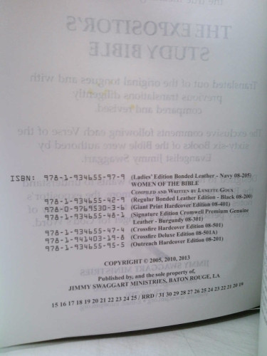 The Expositors Study Bible King James Version Ladies Edition by Jimmy Swaggert Shelf and handling wear to cover and binding, with general signs of previous use. Hinge is a bit loose. Presentation page is filled out. Text is clear of markings and notations. Secure packaging for safe delivery.