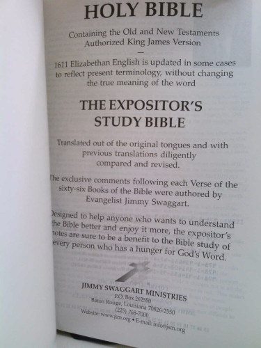The Expositors Study Bible King James Version Ladies Edition by Jimmy Swaggert Minor shelf and handling wear, overall a clean solid copy with minimal signs of use. Box is in good condition. Presentation pages are blank. Secure packaging for safe delivery.
