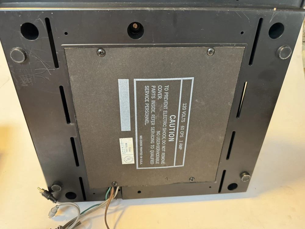 Powers on. Automatic and all speeds work. Probably needs to be re greased. Sold as is. Please note photos of cover and two damaged cracks. Note: chrome ring in center of turntable needs double stick tape to reapply. Priced to sell. No returns.