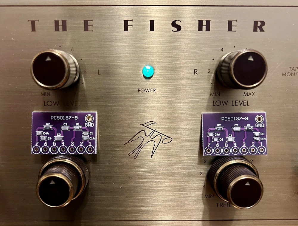 An instant upgrade or replacement for the printed electronic circuit used for tone control compensation in your Fisher tube gear. This listing is for 2 boards. There are two per stereo receiver, preamp or integrated amplifier, so one purchase is all you need for one piece of equipment. This model PEC is specifically used in lots of Fisher gear, including the 500C, 500B, 800C, 800B, 400 receiver, X100-B, X101-C, X101-D, X202-C, Custom Electra IV Console, Philharmonic V Console and perhaps many other Fisher integrated amplifiers and consoles. The sound improvement is immediately noticeable. The components on this board are the same values and arrangement as appearing on the schematic, so no modifications to the original sound. Where the improvement happens is that these new components are miniature 2% tight tolerance film capacitors and 1% tight tolerance resistors. The original units used ceramic capacitor construction and resistor tolerances were much looser than 1%. Installation is easy, just snip the leads from the original part, insert the leads into the numbered holes and solder. There is also a ground plane built into the new part for additional shielding. A ground wire to the chassis ground shall be soldered into this hole I am showing in pictures, these boards installed in my 500B receiver, shown alongside the PEC’s they replace, as well as the receiver before the replacement. I thought the receiver sounded great previously, but installing these had woke this receiver up, every aspect that I thought sounded good in this receiver just immediately sounded better when these were installed.