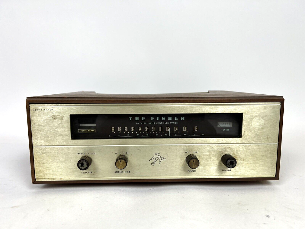 The Fisher Model KM-60 Vintage Receiver Wide-band multiplex tuner Needs Restoration Hey there! You are looking at a Vintage Fisher model KM-60 Receiver Wide-Band Multiplex tuner! This unit is in fairly good condition with its case having only a few scratches and some bottom legs are missing which is to be expected from its age. Besides that the unit is very shiny! We have tried to power on the unit and it does not go on. Therefore it will need to be restored which would make a great project for someone looking to get into vintage audio or add to their collection. The Fisher KM-60 is becoming more rare everyday, pick one up while you have the chance. Thanks for looking check out our other listings for more great deals!