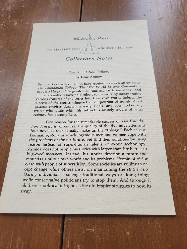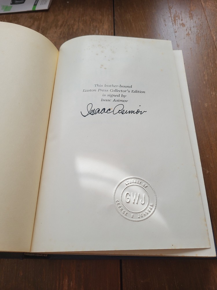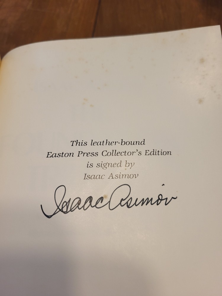 Easton Press - Isaac Asimov - The Foundation Trilogy. Published in 1988. Signed by the Author. A classic from the Easton Press Masterpieces of Science Fiction collection. Originally published in 1951 - 1953. Includes Collector's Notes (single-page, two sided precis). Asimov's Future History series has grown to encompass many more Foundation stories than these original three. It also includes his Robot stories and his classic "The End of Eternity", which explains why humanity is the only intelligent life in the Foundation universe. * besides Robots *
