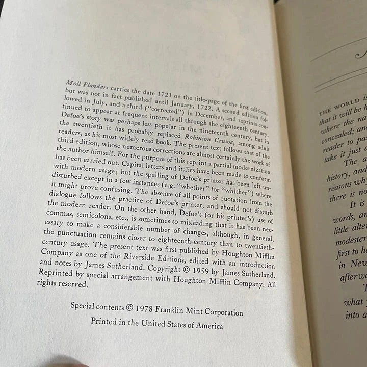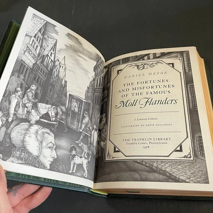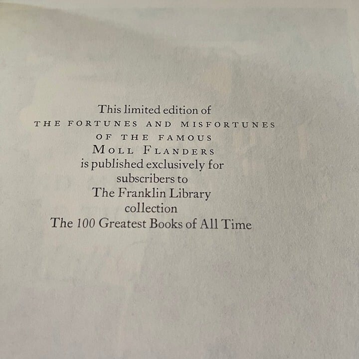 The Franklin Library | 100 Greatest Books of All Time Collection | Limited Edition Daniel Defoe | The Fortunes and Misfortunes of the Famous Moll Flanders | HC 1978 - Book Bindings are: [Hardcover] - Books are packaged in a [Brown Box] - Condition of Book is: GOOD VERY GOOD CAN BE DESCRIBED AS: * Leather hardcover binding with gilt detailing. * Crisp Clean pages, no markings or writing. * Tight bindings/spine. No loose pages * Gold lined fore edges * Has satin ribbon attached to book. * Top of inside cover is slightly discolored around border. (From being closed kept on shelf). See 2nd photo for reference. * Front cover has white swerved line near top. - All reasonable offers are welcomed & can be submitted using the offer button. - Custom bundles can also be made, please message so i can make a separate listing. - All titles included in listing are in photo, also show condition and any notable damages. - Ships from South Gate, CA within 24 business hours M-F.