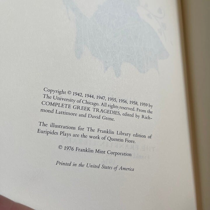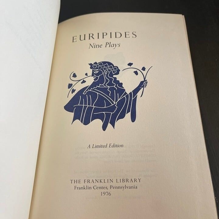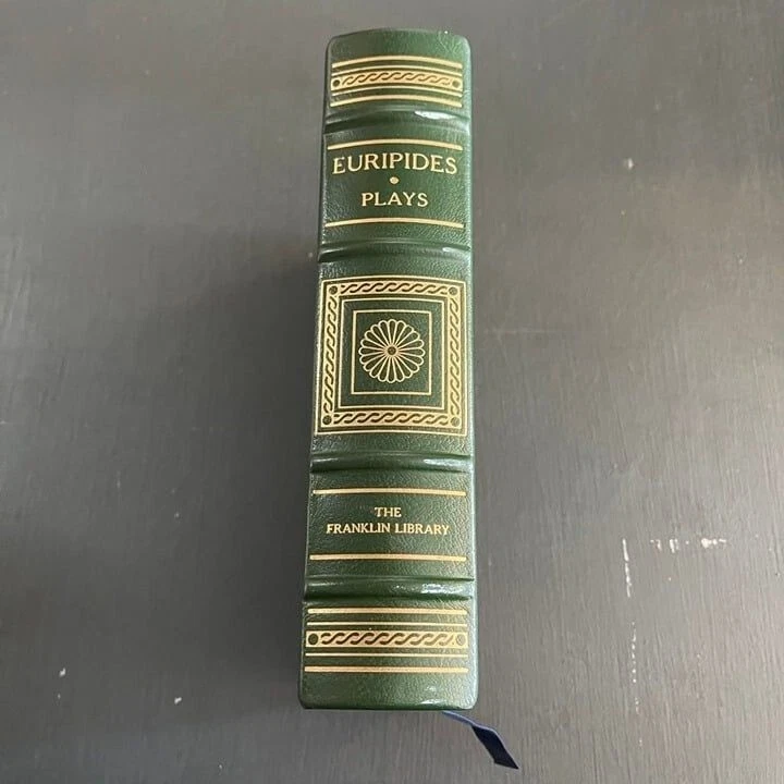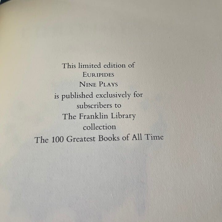 The Franklin Library | 100 Greatest Books of All Time Collection. Euripides | Nine Plays 1976 [Limited Edition] Plays included are: Medea, The Trojan Women, Orestes, Hippolytus, Electra, Iphigenia in Tauris, Alcestis, Heracles - Book Bindings are: [Hardcover] - Books are packaged in a [Brown Box] - Condition of Book is: VERY GOOD VERY GOOD CAN BE DESCRIBED AS: * Leather hardcover binding with gilt detailing. * Crisp Clean pages, no markings or writing. * Tight bindings/spine. No loose pages * Gold lined fore edges * Has satin ribbon attached to book. * Top of inside cover is slightly discolored around border. (From being closed kept on shelf). See 2nd photo for reference. * No cover markings or notable damages to spines / edges. - All offers are welcomed & can be submitted using the offer button.