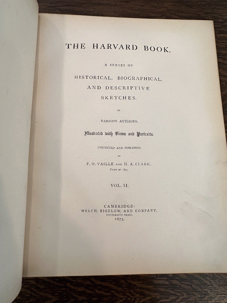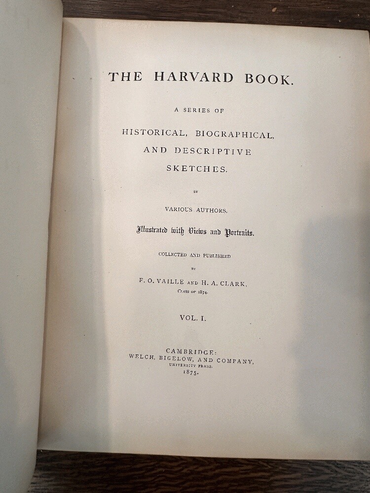 The Harvard Book: A Series of Historical, Biographical, and Descriptive Sketches, by various Authors, Illustrated with Views and Portraits (2 Vols.) Author: F. O. Vaille; H. A. Clark Publisher: University Press; Welch Bigelow and Company Publication Date: 1874; 1875 Qty Available: 1 Condition: Collectible: Good Sku: 053766 Notes: 2 original large full leather hardcovers, Volumes 1 & 2. (1874 and 1875). Each measuring approx 12" x 14" x 3". No scent, no marks. Covers are scuffed, rubbed and worn at edges and corners. Bright gilt edges. Hinges intact and binding secure. Your purchase benefits literacy and summer reading programs in Cincinnati and Hamilton County, Ohio. We ship every business day. All books ship in cardboard bookfolds with delivery confirmation. Sets or unusually heavy items ship in a box. Please contact us for more information.