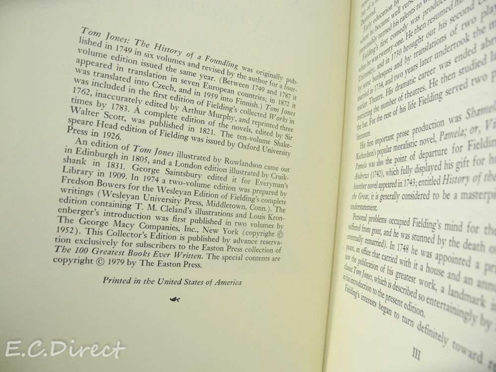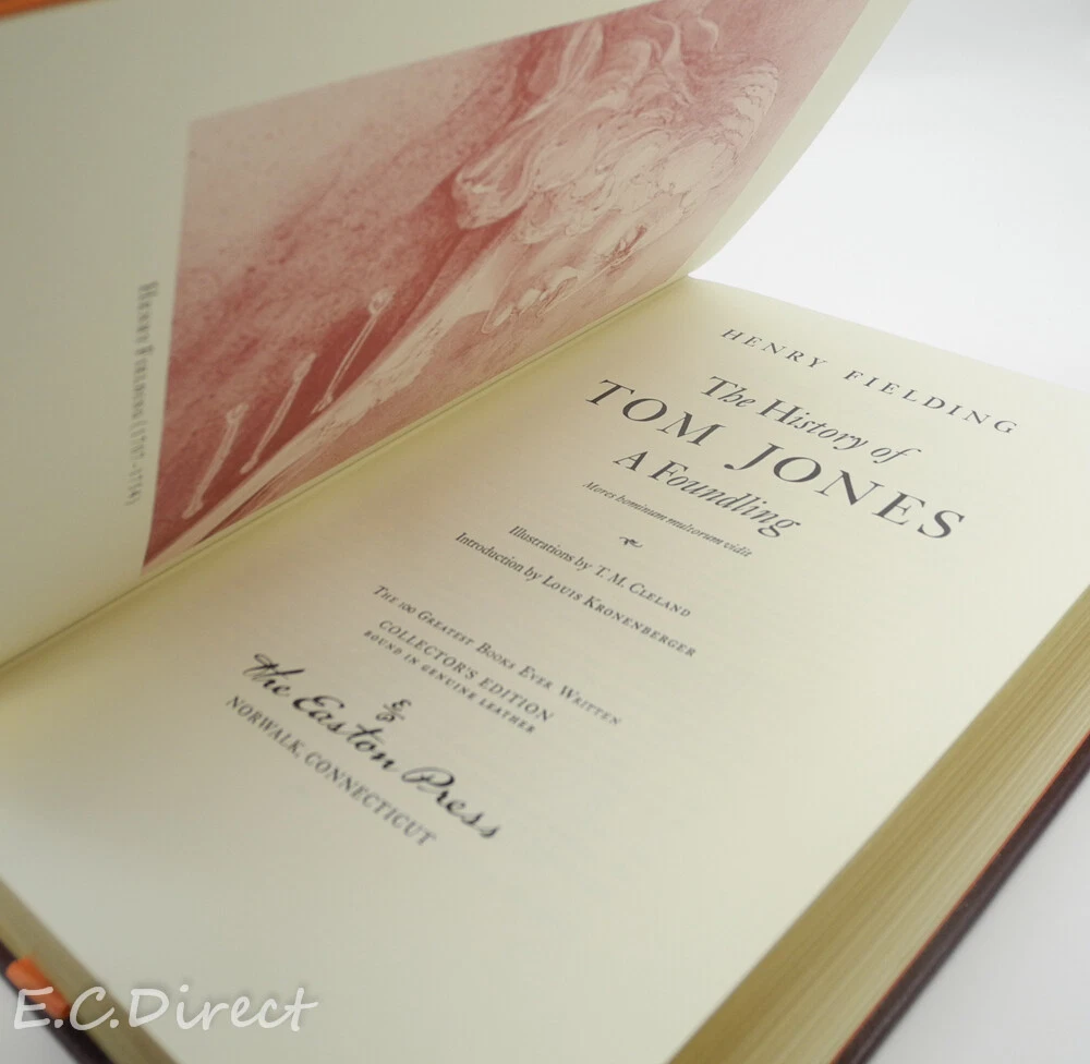 The History of Tom Jones, A Foundling, by Henry Fielding Easton Press Published by Easton Press, it is a beautiful, leather bound hardcover edition produced as part of Easton Press' "100 Greatest Books Ever Written". The spine is ribbed and the page edges have a gold gilt. The spine, boards, and page edges are decorated with 22k gold gilt. The book is printed on archival quality paper, has Smyth-sewn pages (so the book will lay open on a table) and comes with a satin page ribbon/marker as well as moire end-pages. See pictures to see actual condition. Also note I will be listing many more Folio, Easton Press and Franklin Library. Free shipping on the Easton Press books via Media Mail (well wrapped and in bubble mailer), with priority mail as an additional option. View Other listings or eBay store Store home Leather Books Toys and Games Cast Iron Vintage Postcards Art Glass Other Thank you, E C Direct. Please ask questions before bidding.