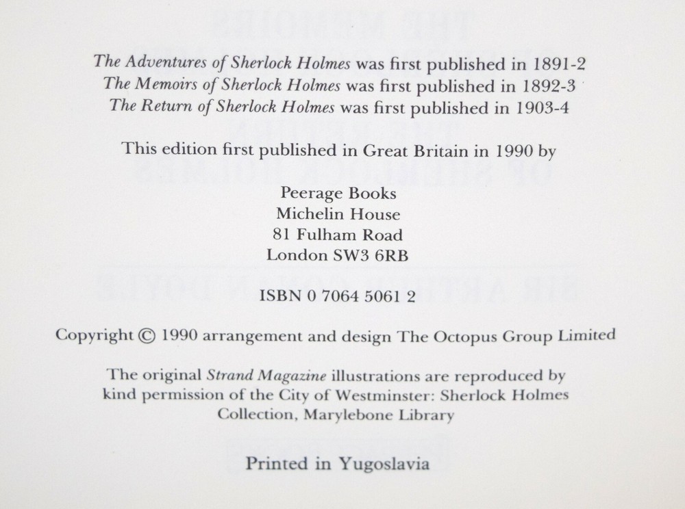 ROESSLER'S RETAIL The Illustrated Sherlock Holmes "The Stories" by Sir Arthur Conan Doyle - 1990 Year: 1990 Type: Hardcover Publisher: Peerage Books Condition: Very Good Flaws: Shows very little wear consider it's 30 years old. If there is a problem with your item p lease contact me through eBay by sending a message and I will work with you to take care of the issue immediately. We care about all our customers and want you to have a pleasant shopping experience so you will come back and shop with us again! Payment Payment is expected within 2 days of sale. If you cannot pay within that time frame, please send a message prior to purchasing so we can note the account. Payment must be made by PayPal. Shipping Items are shipped out the next day. If you purchase and pay for an item on Saturday, Sunday, or a Holiday, it will be shipped out the very next BUSINESS day. Feedback We leave feedback on the same day that an item is paid for. I ask that you please leave positive feedback for us when your item arrives. If there is any problem with your item that would prevent you from leaving positive feedback, please contact before you enter a neutral or negative to see if there is a remedy to your situation. Please be kind and take the time to leave feedback. It is much appreciated! RETURNS - 30 Day HASSLE Free Return Policy Most of our items have a 30 day return policy. Please check your items as soon as possible once your receive them. If you do need to return an item, please use eBay's RETURN option and follow the prompts. It makes the process easier on both the buyer and seller allowing you to keep track of your item as it makes its way back to us. As with almost everything, communication is the key to a successful transaction for all parties. If there is a problem, please let us know what we can do to make the situation right. Thank You - Please Come Back Soon!
