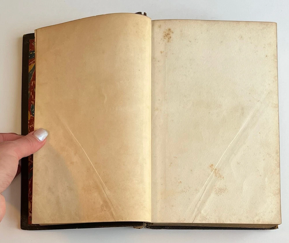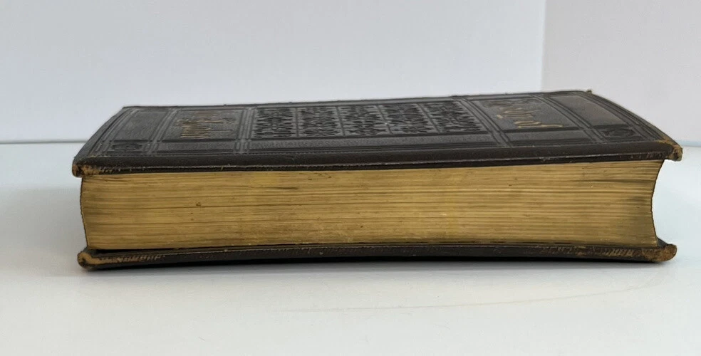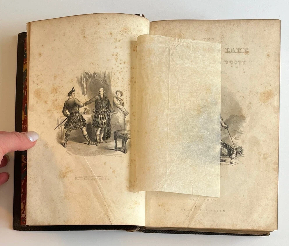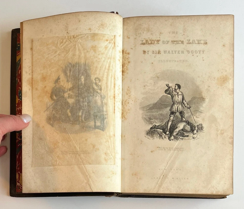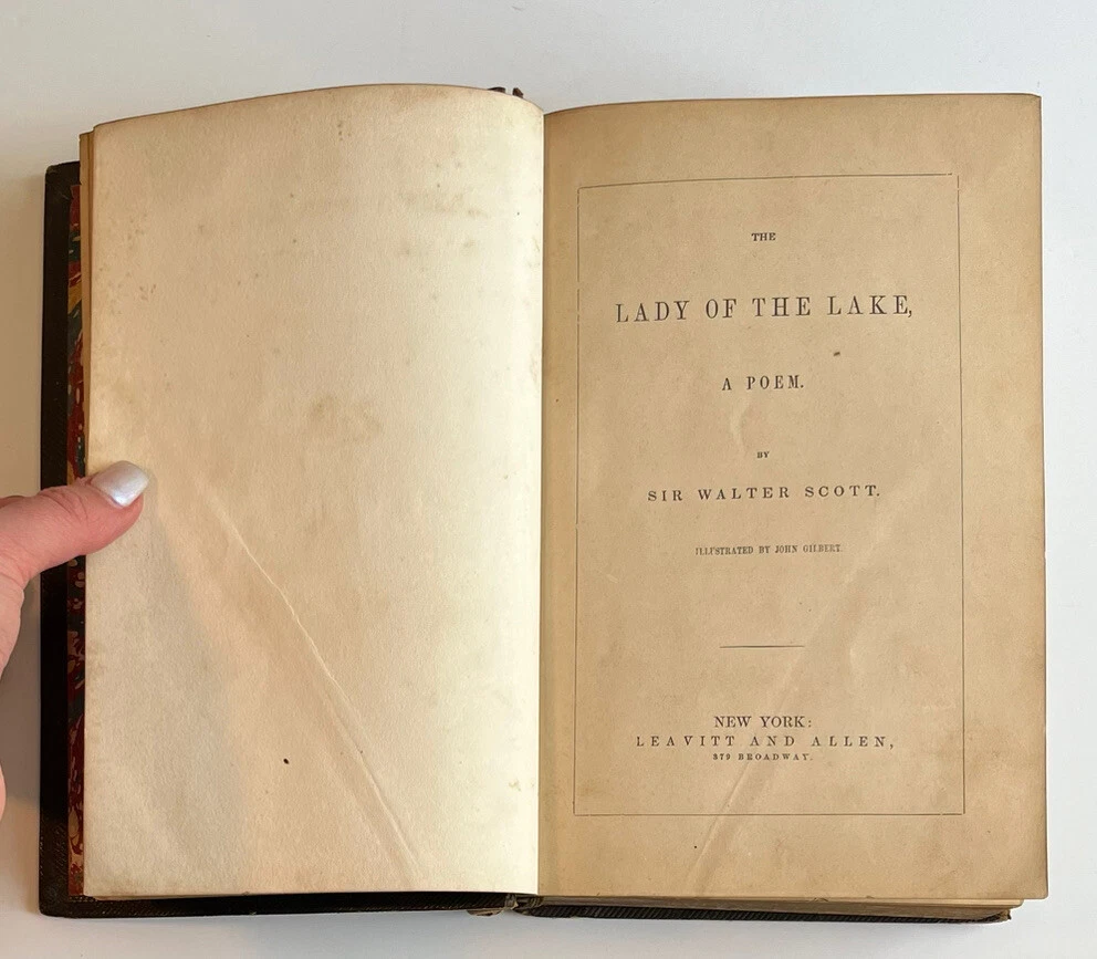 The Lady Of The Lake Sir Walter Scott Leather Bound Gold Gilt Leavitt & Allen. Antique and collectible and preowned condition so expect wear and tear. Its worn around the edges and the spine of the book and the leather is peeling off. There is about an inch and a half of splitting at the back lower cover where it meets the spine which I have included a photo of. Please review all the photos for the best description. I would say this book is in good condition as all the pages are intact. Contains illustrations throughout the book. It’s a very old book however, it is not dated in the book anywhere. Was published by Leavitt & Allen New York. There’s multiple areas of age related discoloration throughout the book. If you have any questions, feel free to message me. Thanks!