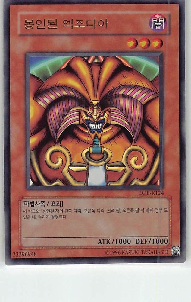This is a nice example of a The Legend of Blue Eyes White Dragon #LOB-K124 Exodia the Forbidden One Other important information about this card: Korean Rare In 2003 Exodia the Forbidden One played for the . Please check out our other listings for more great cards.