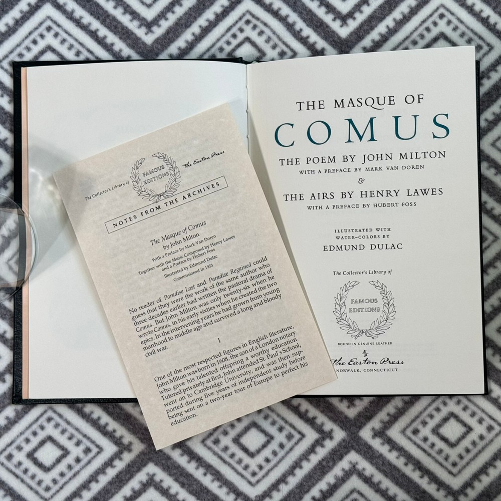Easton Press Famous Edition Series - The Masque of Comus by John Milton. Standard Easton Press book; leather-bound with 22kt gold accents, acid neutral paper, satin-ribbon page marker and sewn pages. No nameplates attached or unattached. Photos are of actual book. If you see other books or items in my store that you would like to purchase, I can combine shipping to save cost. Message me for details.