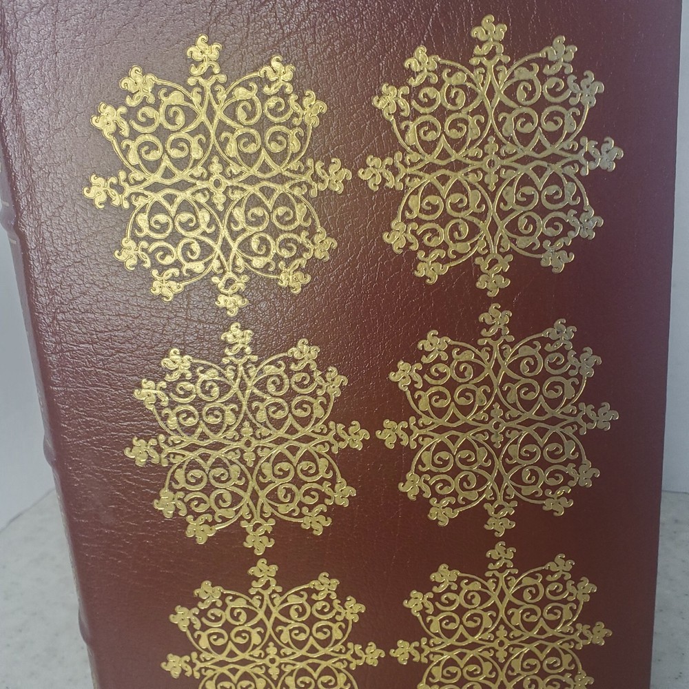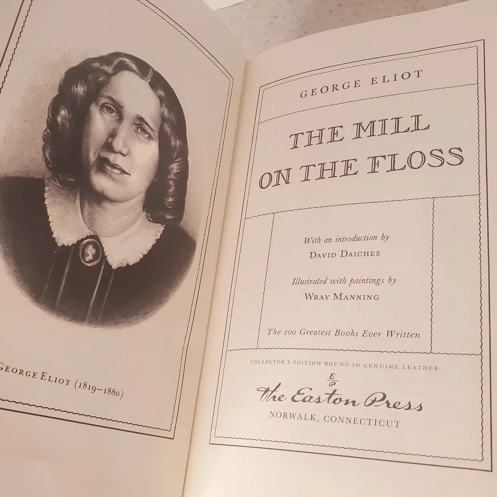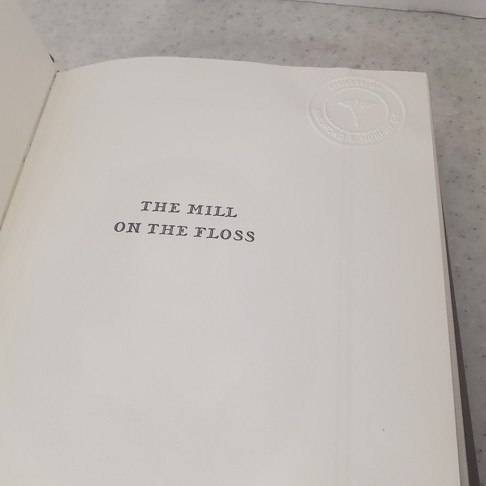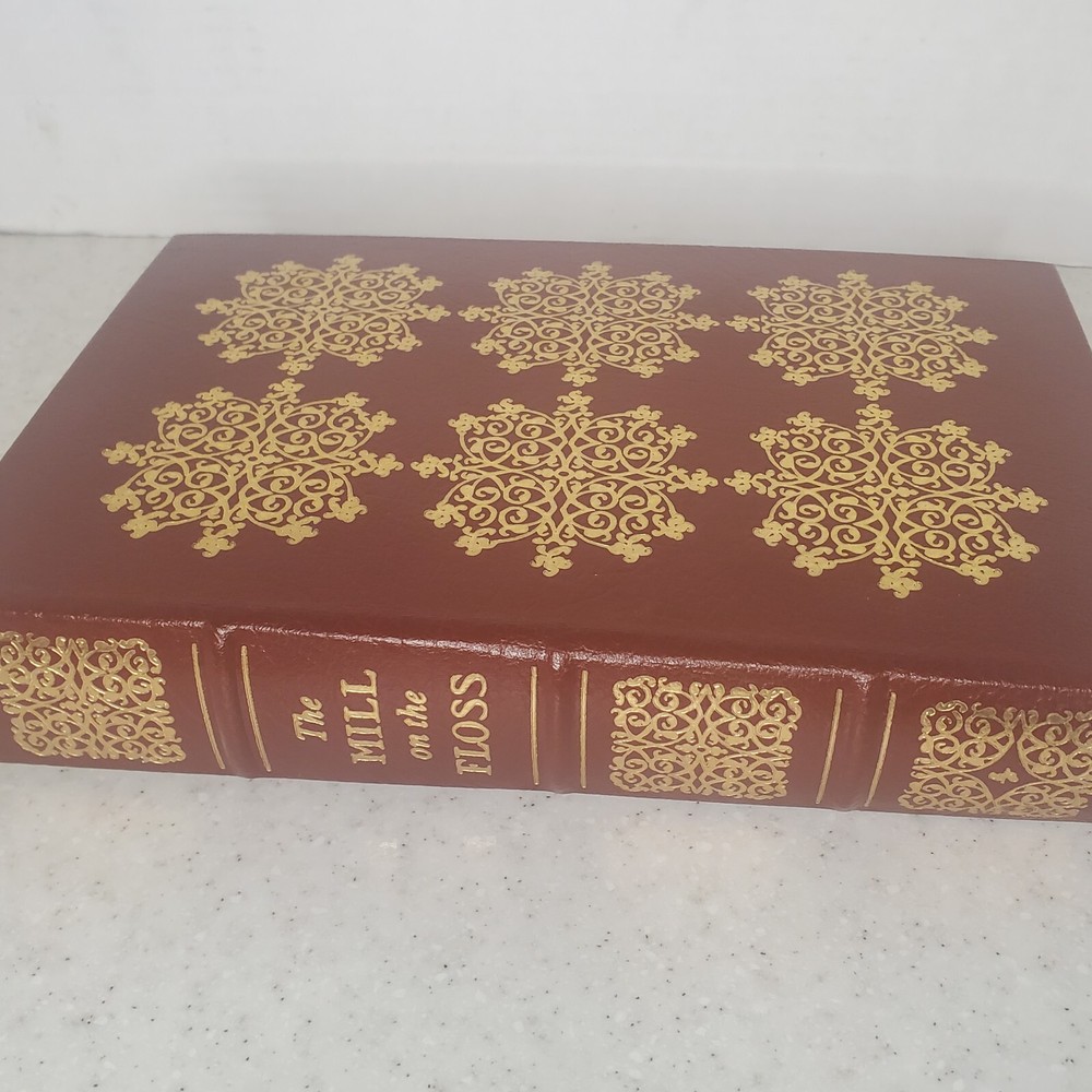 The Mill on the Floss Novel by George Eliot Leather Bound Collector Edition. 1980 copyright. Hardcover red leather cover with shimmer gold design. Silver edges. No writing/markings that I noticed, just has an embossing punch from previous owner on cover pages.The Mill on the Floss Novel by George Eliot Leather Bound Collector Edition
