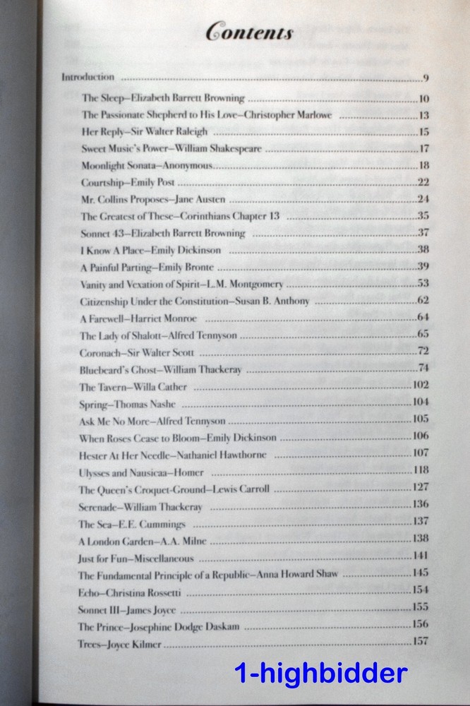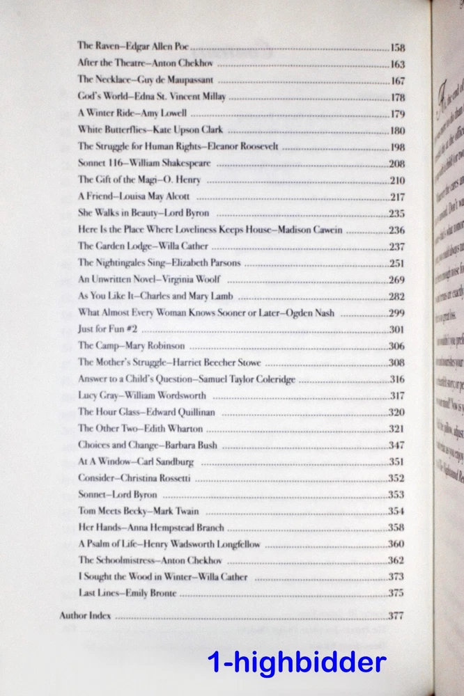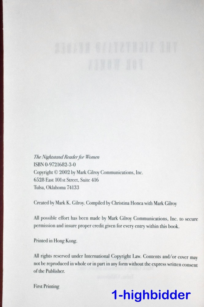 The Nightstand Reader for Women: Brontë, Dickinson, Browning, Shakespeare ++ _______________________________________ The Nightstand Reader for Women Compiled by Mark Gilroy Published by Mark Gilroy Communications (2003) Condition: LIKE NEW 1st Edition Hardcover Book! The binding is tight and all 378 pages within are bright white with NO WRITING, UNDERLINING, HIGH-LIGHTING, RIPS, TEARS, BENDS OR FOLDS with a small repaired tear at the top of the Presentation page (shown). The covers look perfect, as can be seen in my photos. You will be happy with this one! Always handled and packaged with care! Buy with confidence from a seller who takes the time to show you the details and not use just stock photos. Please check out all my pictures and email with any questions! Thanks for looking! About the Book: The Nightstand Reader for Women by Mark Gilroy is a beautifully curated collection of timeless literature and thought-provoking writings designed to inspire, entertain, and uplift women. Blending classic and contemporary works, this anthology features short stories, poetry, inspiring speeches, humorous insights, and powerful quotes, celebrating the art of reading and reflection. The collection includes works from literary icons such as Emily Brontë, Elizabeth Barrett Browning, Robert Frost, Louisa May Alcott, Christina Rossetti, William Shakespeare, and Emily Dickinson, alongside passages from the Holy Bible and other profound sources. Carefully selected to offer a rich and diverse reading experience, the book provides moments of wisdom, comfort, and joy—perfect for winding down at the end of the day. Beyond its literary depth, the book is exquisitely bound in a luxurious bonded leather case, adorned with a whimsical full-color illustration tipped onto the cover. It features four raised hubs on the spine, rough-cut page edges, generous gold stamping, and a silky ribbon marker, making it not only a pleasure to read but also a sophisticated decorative piece. Whether as a treasured personal keepsake or a thoughtful gift, The Nightstand Reader for Women adds both literary charm and elegance to any nightstand, guest room, or reading nook. Copyright © 2018-2025 TDM Inc. The photos and text in this listing are copyrighted. I spend lots of time writing up my descriptions and despise it when un-original losers cut and paste my descriptions in as their own. It is against ebay policy and if you are caught, you will be reported to ebay and could be sued for copyright infringement and damages.