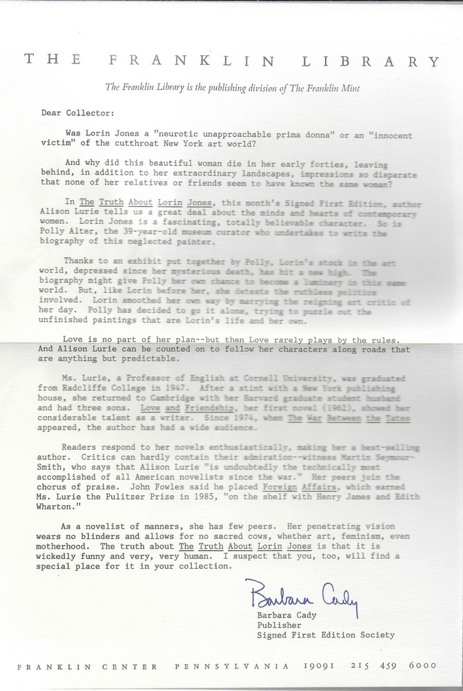 The Truth About Lorin Jones by A lison Lurie , Signed 1 st Edition, Franklin Library, F rontispiece by Anthony Russo Franklin Library , Franklin Center, PA published the book, special contents copyright 19 8 8 . Alison Lurie signed the front flyleaf. The book is part of Franklin Library’s series The Signed First Edition Society . The interior, beautiful leather cover, decorative end papers, and attached bookmark are in f ine condition. There are no marks, tears or bookplates . . The page edges are richly gilded to seal out moisture. The book is 6 1/2 ” x 9 1/2 ” and 328 pages, plus a 1 page colophon . Laid in the front is the Franklin Library letter about the book and author. Please if you need any additional information and photos, eBay message me. Combine Shipping Discount!!!!! Save money when you buy more than one item (lot) from us! Except in rare cases, s & h to a U. S. address via media mail in the same box is $1.35 for each additional book. eBay may automatically send a combine invoice with the wrong s & h. Please wait to pay until you receive my combine invoice with the correct s & h. PLEASE CHECK OUT MY eBAY STORE AND OTHER AUCTIONS!!! 1 4 20241 0 2024