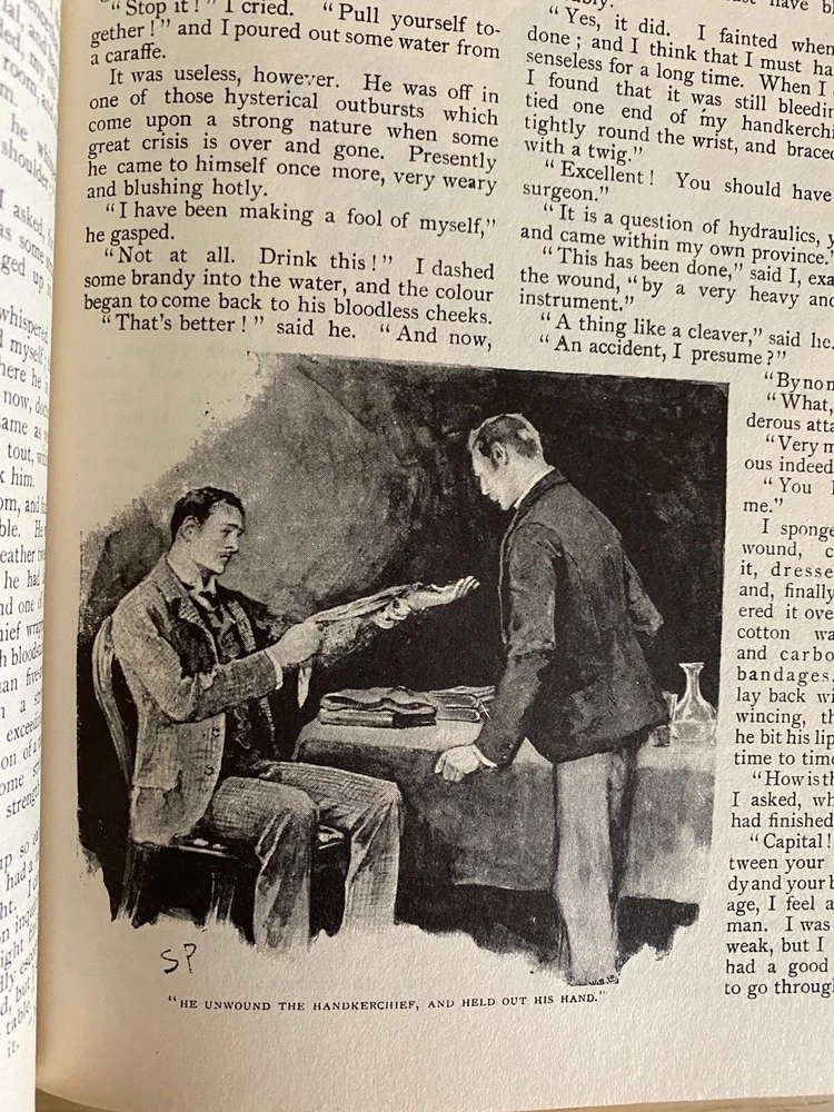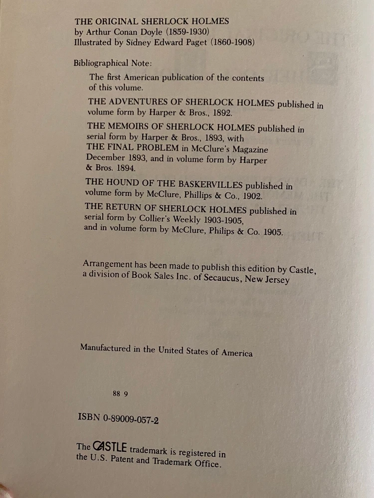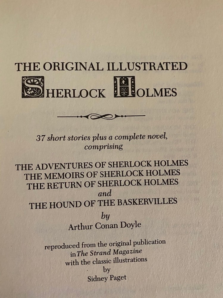 π The Original Illustrated Sherlock Holmes by Arthur Conan Doyle, Bonded Leather/Gold Stamped/Color Only Author: Sir Arthur Conan Doyle Illustrated By: Sidney Paget Hardcover with Sewn Spine Cover Design Printed Directly on Cover Special Attribute: Bonded Leather/Gold Stamped/Color Only Genre: Mystery, Classics, Short Stories, Crime, Literature, Thriller, Detective Fiction Condition: Good Discover the undying thrill of each Sherlock Holmes Adventure. The drawings of Sidney Paget illustrate the stories--illustrations as immortal as the stories themselves as explained in the product information. There is a personalized message in this book located on the third page which causes this book to not be ranked as "very good." Some discoloration due to aging. No missing pages and all pages are attached. No impact on pages, spine or cover due to shelving and aging. See pictures for details. As stated in the Introduction: "In this volume are 37 short stories (published in individual volumes as The Adventures of Sherlock Holmes , The Memoirs of Sherlock Holmes and The Return of Sherlock Holmes ) plus the complete novel The Hound of the Baskervilles ." The Adventures of Sherlock Holmes were originally published in The Strand between July 1891 and 1892. Publisher: Castle Books Publication Year: 2009 Printed in the U.S.A. Language: English Environment: Smoke Free, Pet Free Pages: 636 ISBN: 0890090572 9 1/2 x 6 7/8 x 2 inches Weight: 2 pounds 10 ounces I will combine shipping on multiple purchases. Shipping USPS Media Mail