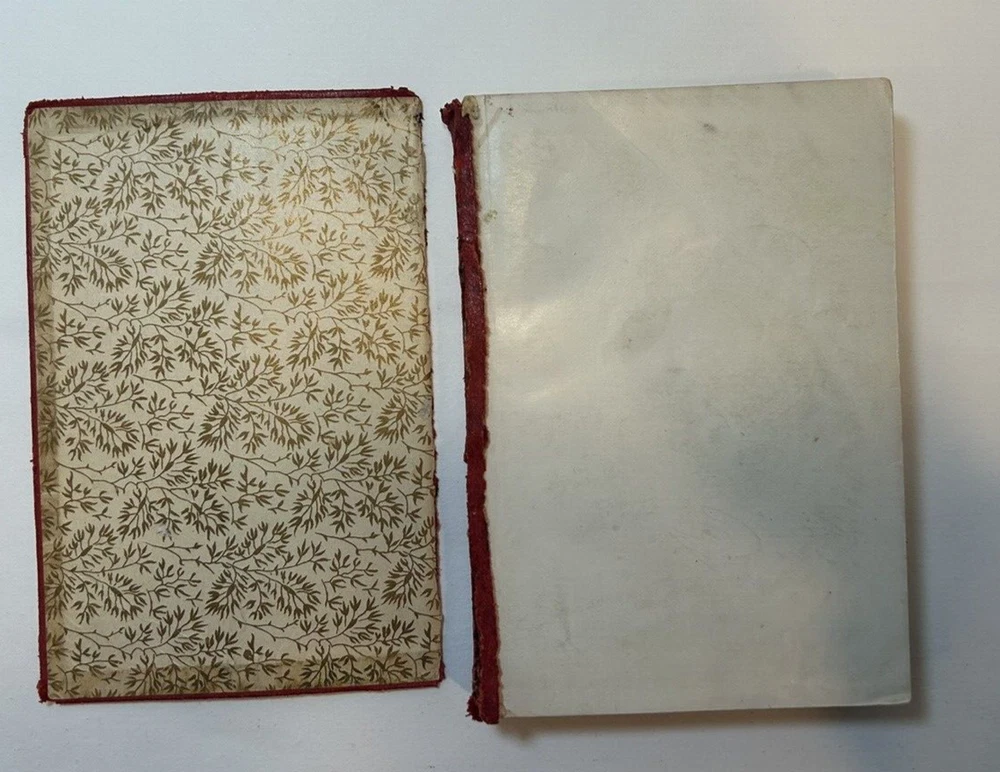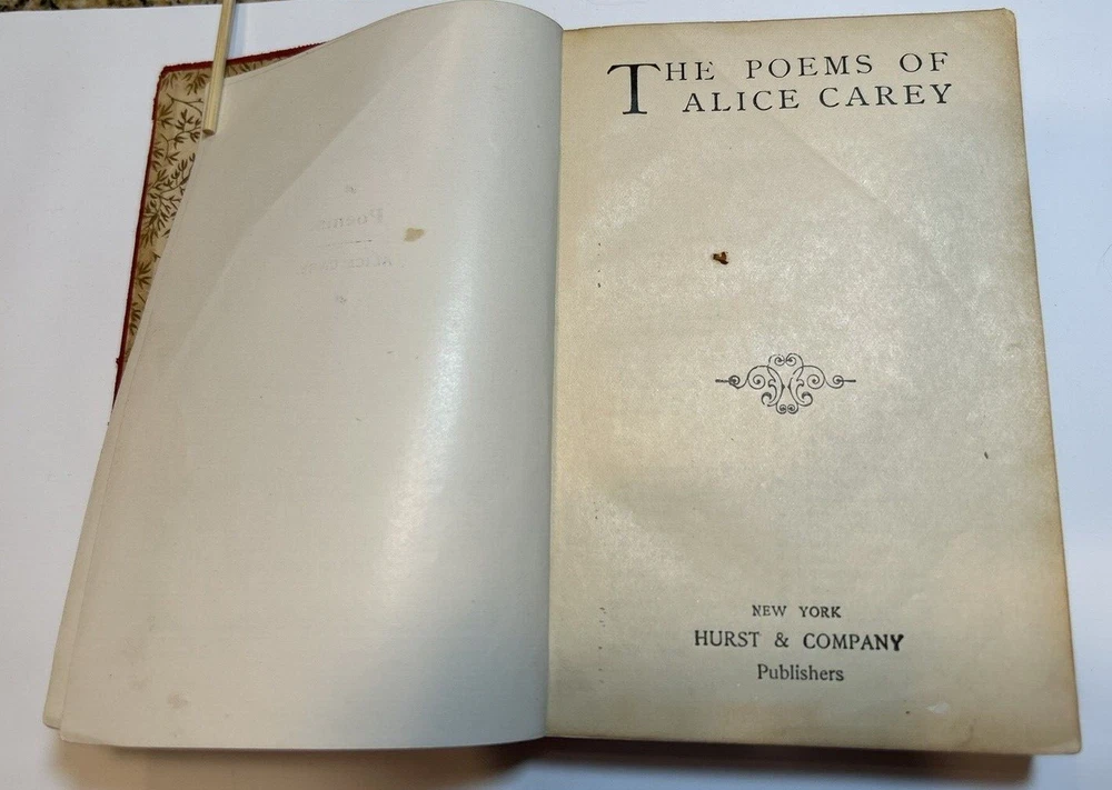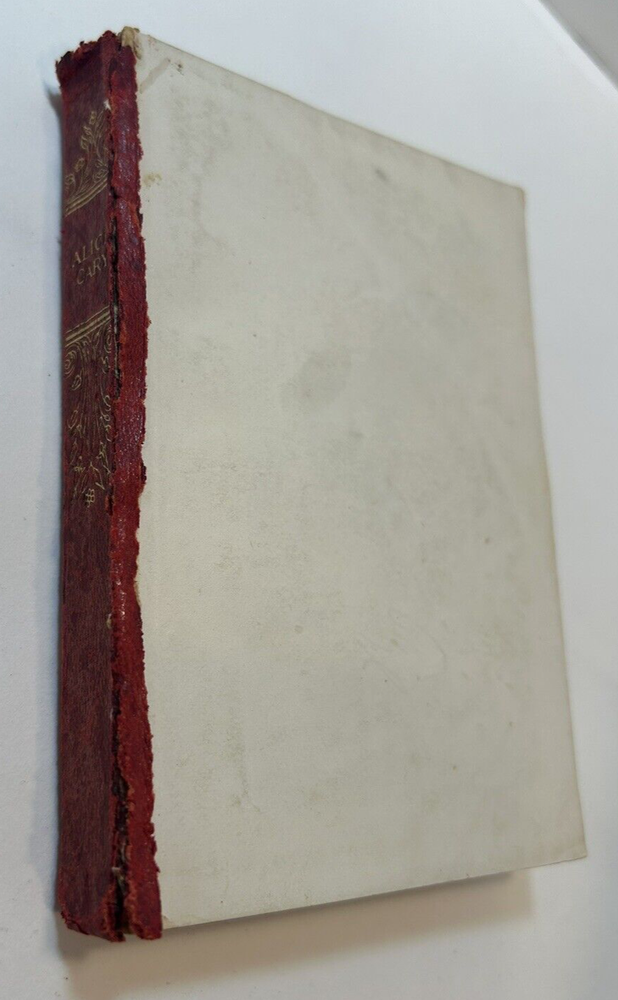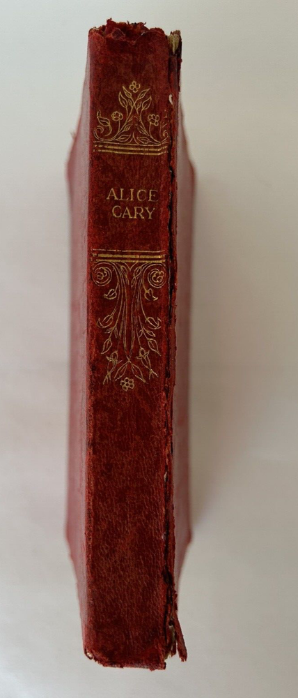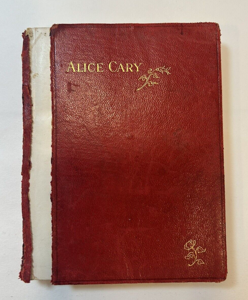 The Poems of Alice Cary, early 1900s, in fair condition. Red limp leather cover. Front cover has been torn off. Back cover is still intact. Both front and back covers have been bent slightly and are scratched. Binding and all pages are intact and still highly bound, text is clean and unmarked. There are, however, a few colored stains on 6-7 pages and 2-3 pages have turned corners. Moderate shelf wear with rubs on the edges and corners. There is some dampstaining on pages inside back cover. Gold gild on the top pages is worn and stained. Book measures 5-7/8" x 4-1/8" x 3/4", 439 pages. Please contact us with any questions before placing your bid. All Sales are Final unless noted otherwise. We do our very best to ensure all Items listed are exactly as described. Please let us know first if you are not satisfied with your purchase and give us an opportunity to rectify the matter before leaving anything but 5-star feedback. We want our customers to be 100% satisfied.