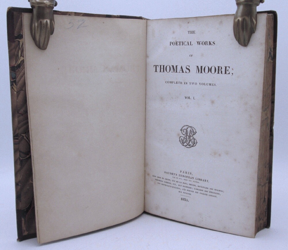 Ivy Ridge Books presents ... The Poetical Works of Thomas Moore Volume I (1835) Author: Thomas Moore Publisher: Baudry's European Library Release Date: 1835-01-01 Seller Category: Poetry Qty Available: 1 Condition: Used: Good Sku: 09534 Notes: Volume one only, of two. The book is bound with marbled paper and leather spine & corners. The paper is scuffed, edges of leather are rubbed. Armorial bookplate inside front cover, light foxing throughout, heavier at front pages. Baudry's European Library 1835. All orders packed with care, dust jackets protected by Brodart sleeve, independent bookseller since 2011 Don't forget to check out other great deals in our eBay Store!!